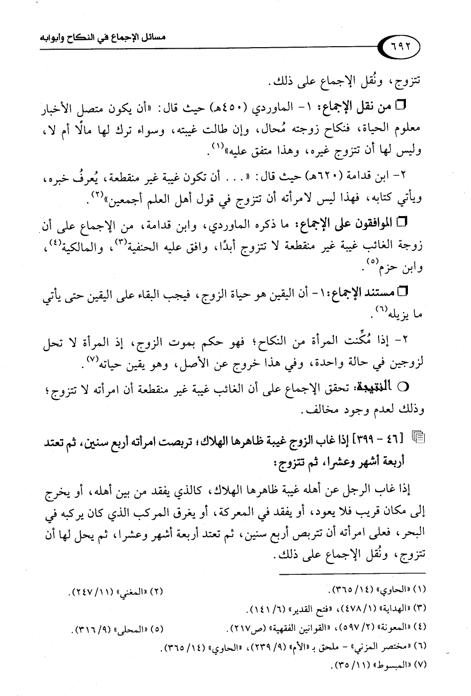 • الموافقون على الإجماع: ما ذكره الماوردي، وابن قدامة، من الإجماع على أن زوجة الغائب غيبة غير منقطعة لا تتزوج أبدًا، وافق عليه الحنفية (¬3)، والمالكية (¬4)، وابن حزم (¬5).