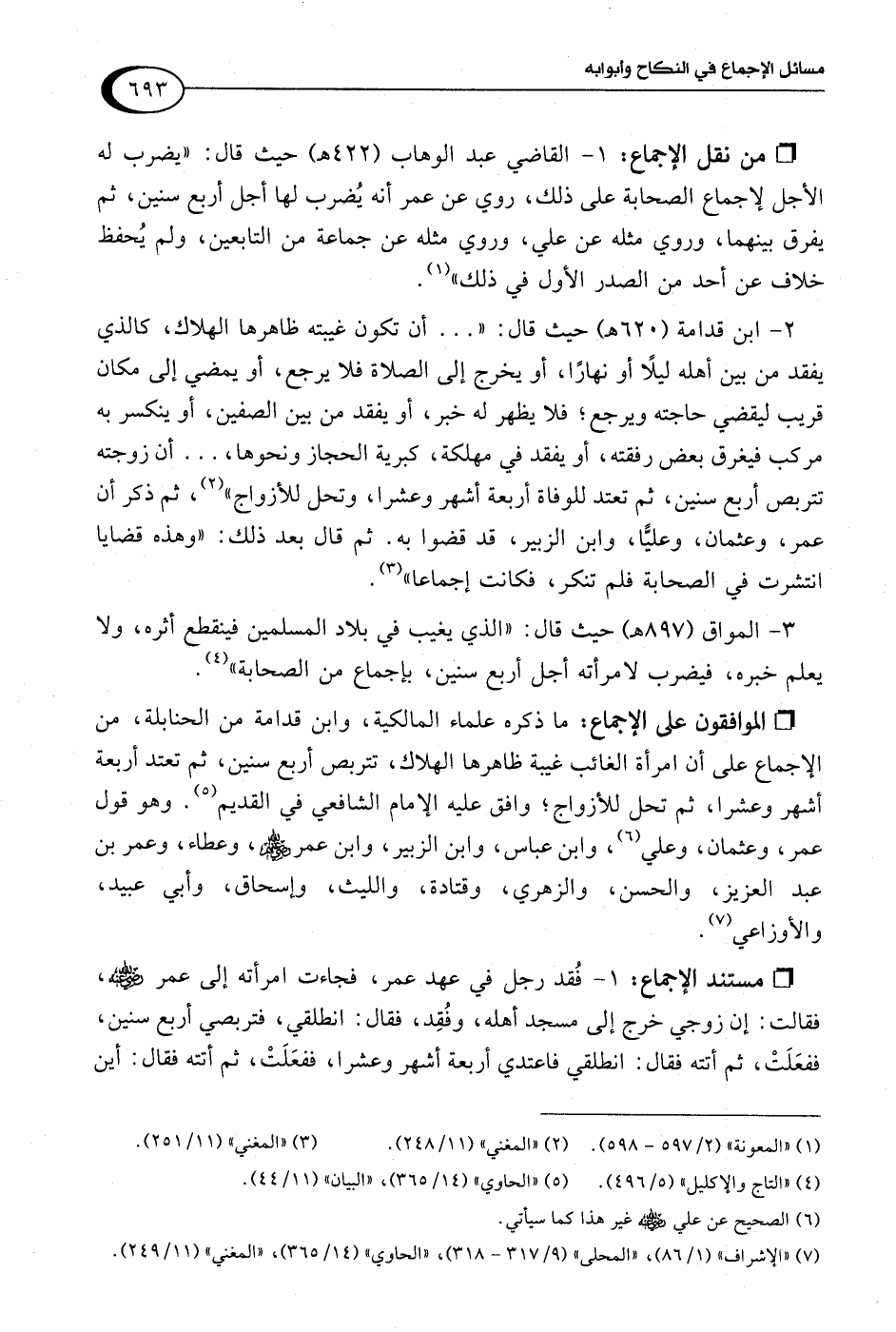 2 - ابن قدامة (620 هـ) حيث قال: ". . . أن تكون غيبته ظاهرها الهلاك، كالذي يفقد من بين أهله ليلًا أو نهارًا، أو يخرج إلى الصلاة فلا يرجع، أو يمضي إلى مكان قريب ليقضي حاجته ويرجع؛ فلا يظهر له خبر، أو يفقد من بين الصفين، أو ينكسر به مركب فيغرق بعض رفقته، أو يفقد في مهلكة، كبرية الحجاز ونحوها، . . . أن زوجته تتربص أربع سنين، ثم تعتد للوفاة أربعة أشهر وعشرا، وتحل للأزواج" (¬2)، ثم ذكر أن عمر، وعثمان، وعليًّا، وابن الزبير، قد قضوا به. ثم قال بعد ذلك: "وهذه قضايا انتشرت في الصحابة فلم تنكر، فكانت إجماعا" (¬3).