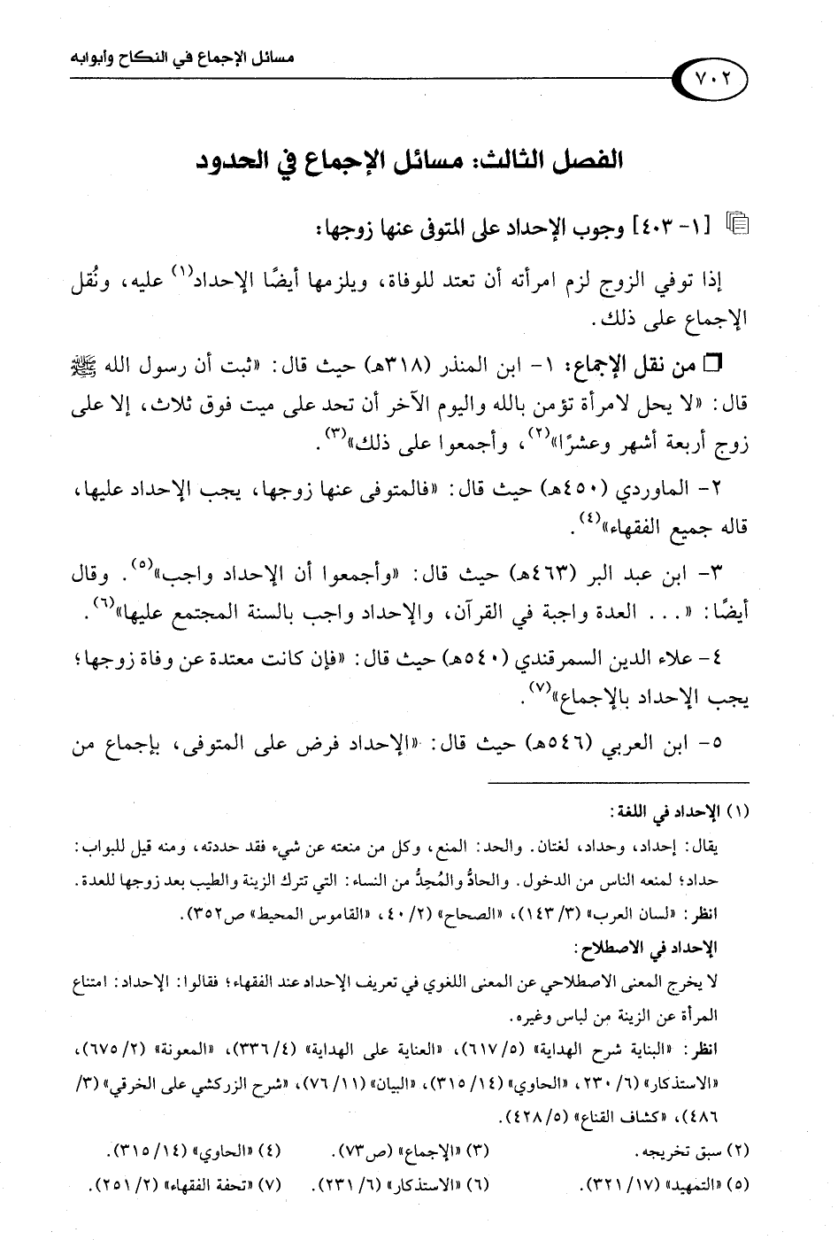 2 - الماوردي (450 هـ) حيث قال: "فالمتوفى عنها زوجها، يجب الإحداد عليها، قاله جميع الفقهاء" (¬4).
