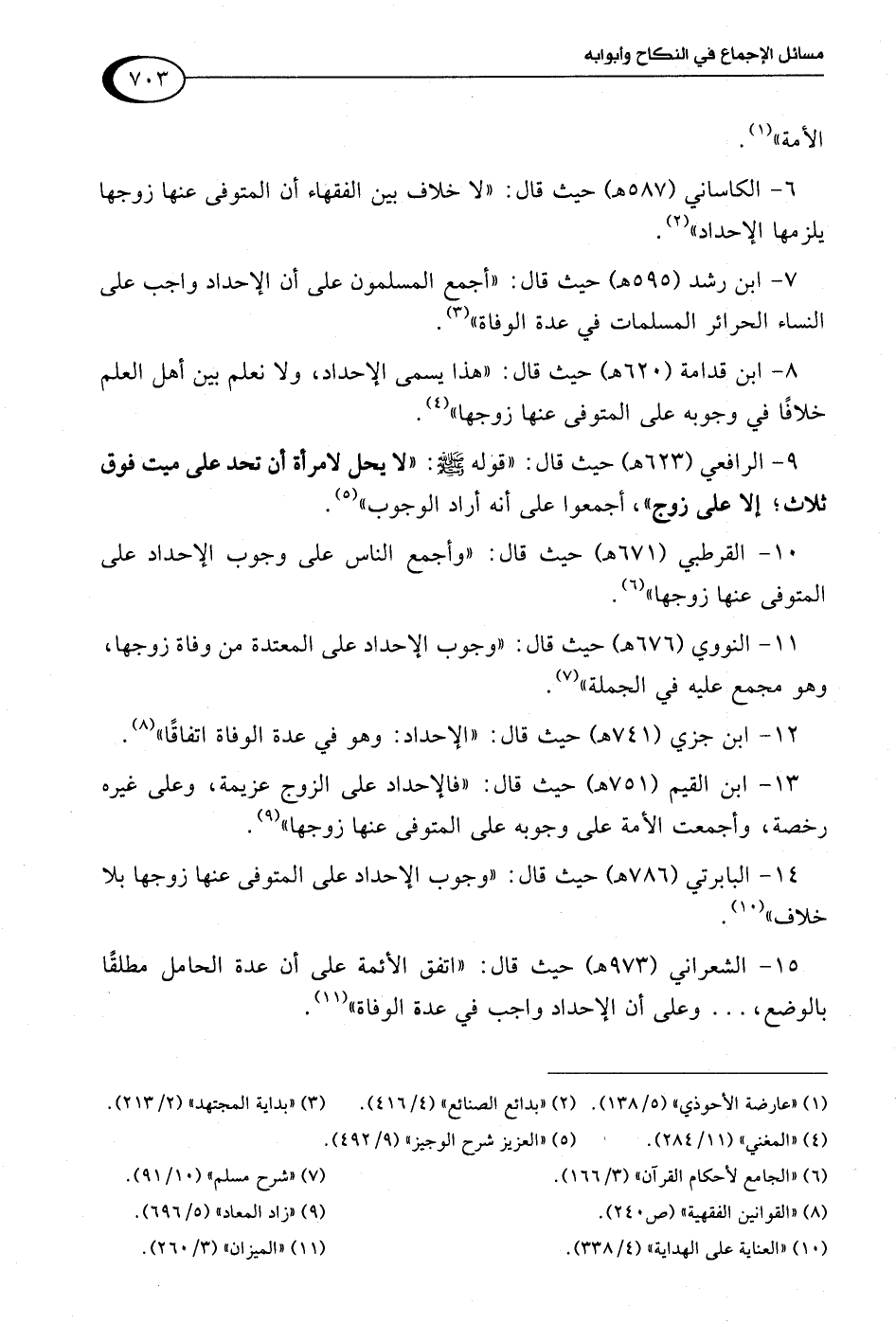 8 - ابن قدامة (620 هـ) حيث قال: "هذا يسمى الإحداد، ولا نعلم بين أهل العلم خلافًا في وجوبه على المتوفى عنها زوجها" (¬4).