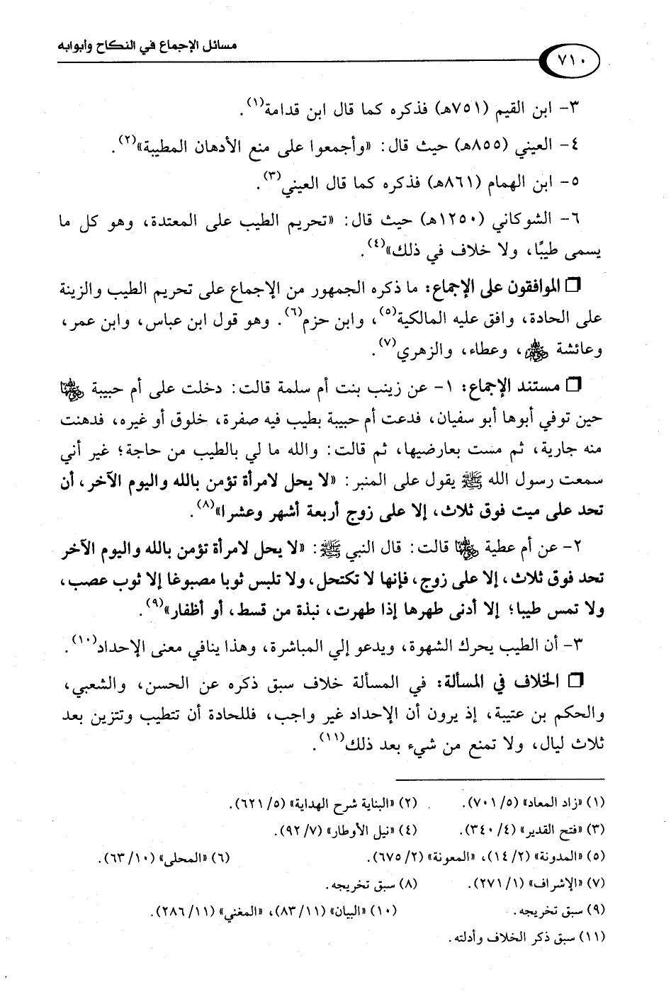 6 - الشوكاني (1250 هـ) حيث قال: "تحريم الطيب على المعتدة، وهو كل ما يسمى طيبًا، ولا خلاف في ذلك" (¬4).