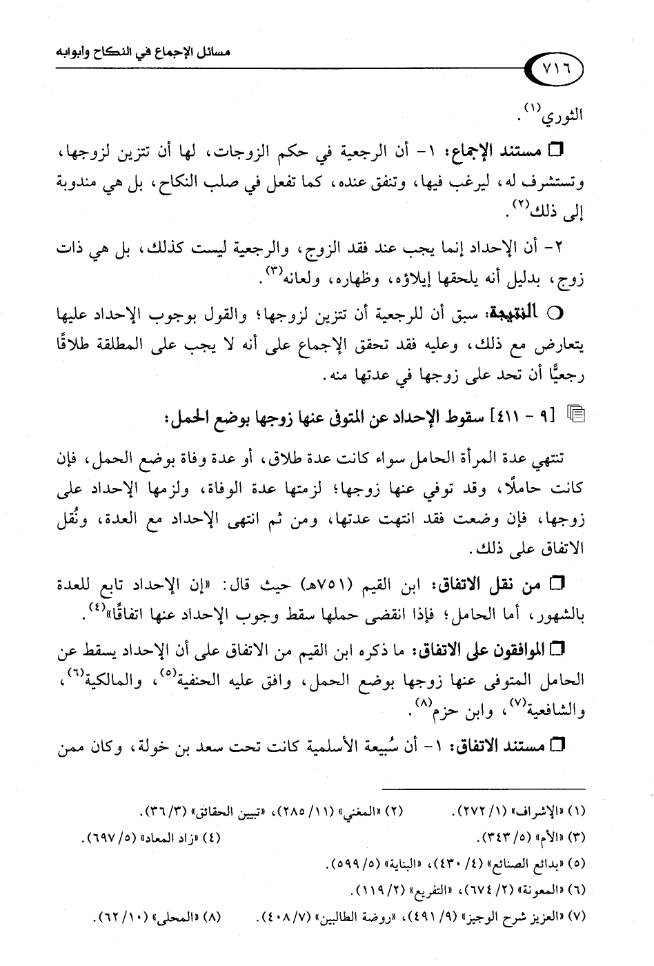 • من نقل الاتفاق: ابن القيم (751 هـ) حيث قال: "إن الإحداد تابع للعدة بالشهور، أما الحامل؛ فإذا انقضى حملها سقط وجوب الإحداد عنها اتفاقًا" (¬4).