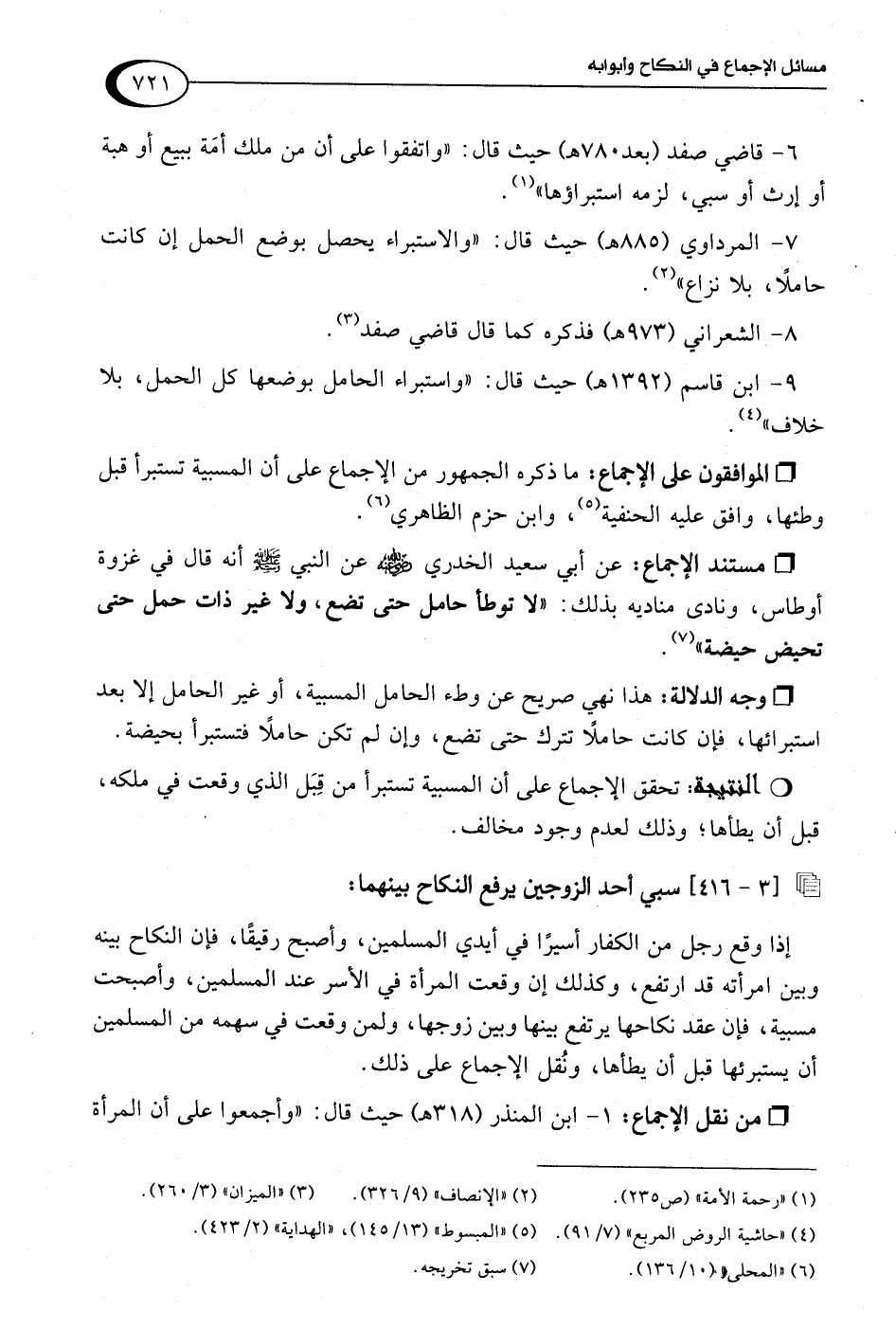 6 - قاضي صفد (بعد 780 هـ) حيث قال: "واتفقوا على أن من ملك أمَة ببيع أو هبة أو إرث أو سبي، لزمه استبراؤها" (¬1).