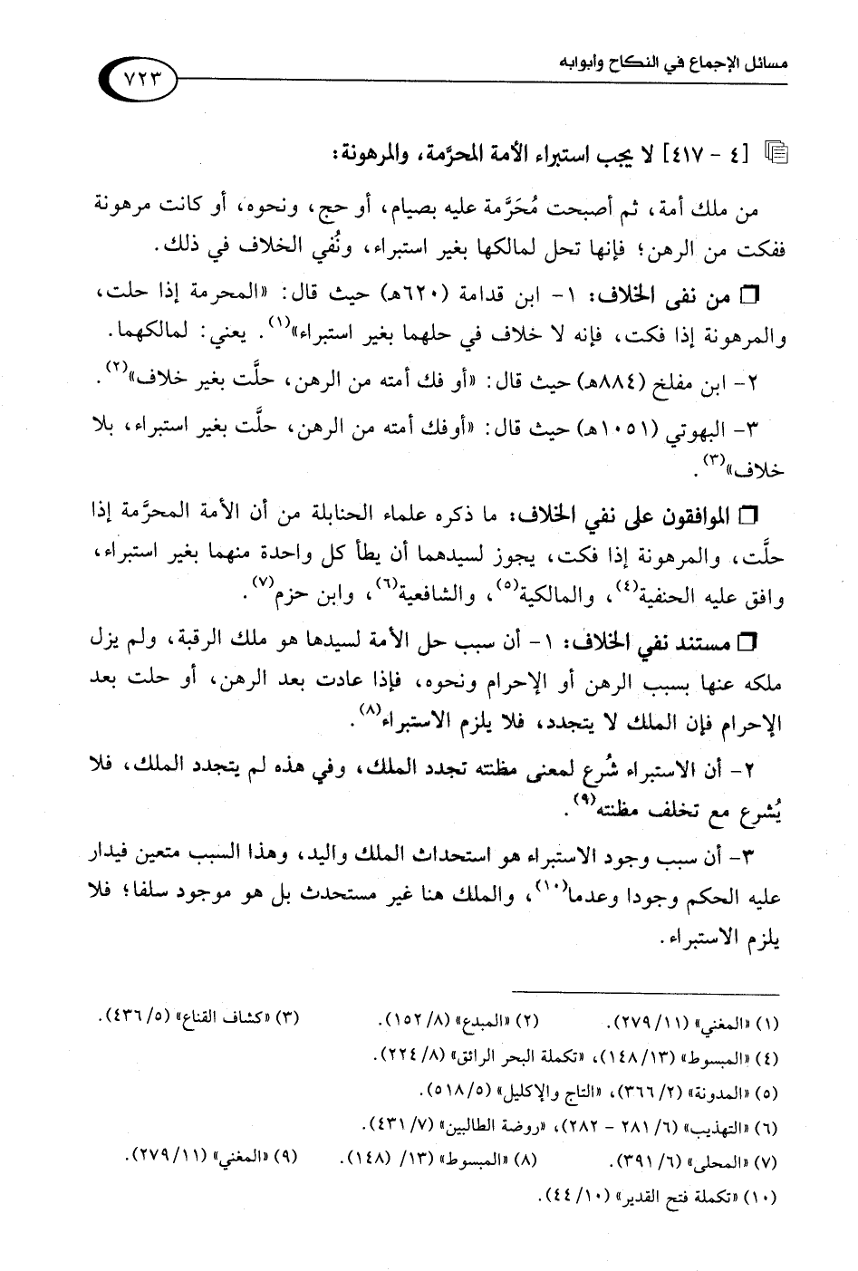 1 - ابن قدامة (620 هـ) حيث قال: "المحرمة إذا حلت، والمرهونة إذا فكت، فإنه لا خلاف في حلهما بغير استبراء" (¬1). يعني: لمالكهما.