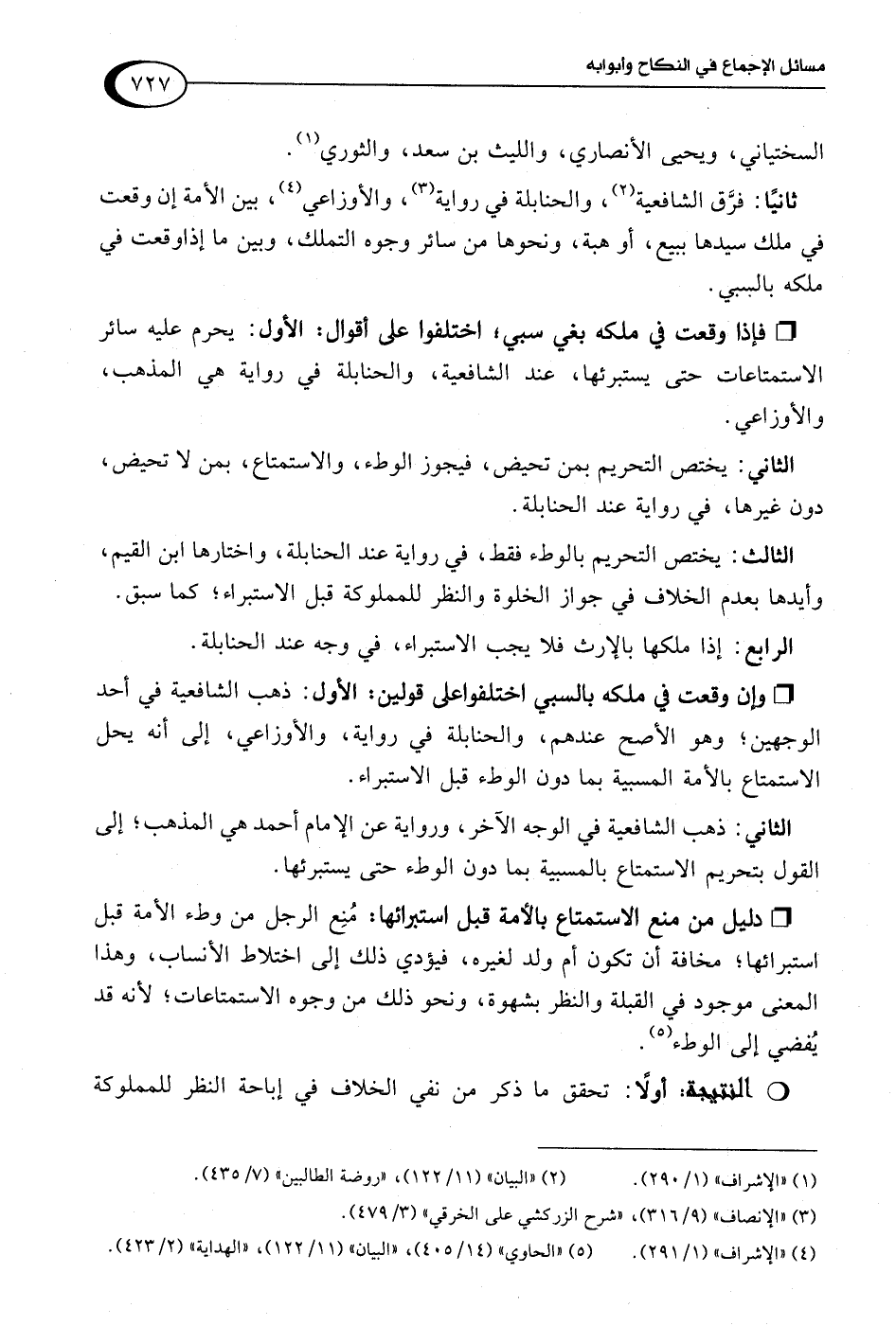 • دليل من منع الاستمتاع بالأمة قبل استبرائها: مُنِع الرجل من وطء الأمة قبل استبرائها؛ مخافة أن تكون أم ولد لغيره، فيؤدي ذلك إلى اختلاط الأنساب، وهذا المعنى موجود في القبلة والنظر بشهوة، ونحو ذلك من وجوه الاستمتاعات؛ لأنه قد يُفضي إلى الوطء (¬5).Rأولًا: تحقق ما ذكر من نفي الخلاف في إباحة النظر للمملوكة