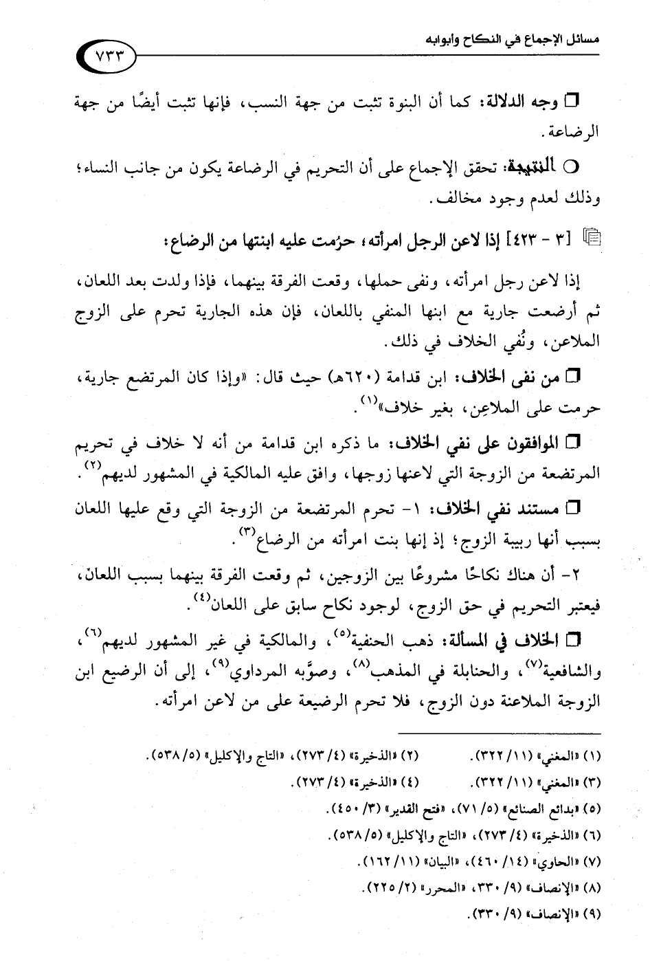 • الموافقون على نفي الخلاف: ما ذكره ابن قدامة من أنه لا خلاف في تحريم المرتضعة من الزوجة التي لاعنها زوجها، وافق عليه المالكية في المشهور لديهم (¬2).