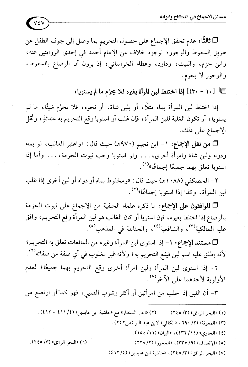 1 - ابن نجيم (970 هـ) حيث قال: "واعتبر الغالب، لو بماء ودواء ولبن شاة وامرأة أخرى، . . . ولو استويا وجب ثبوت الحرمة، . . . وأما إذا استويا تعلق بهما جميعًا إجماعًا" (¬1).