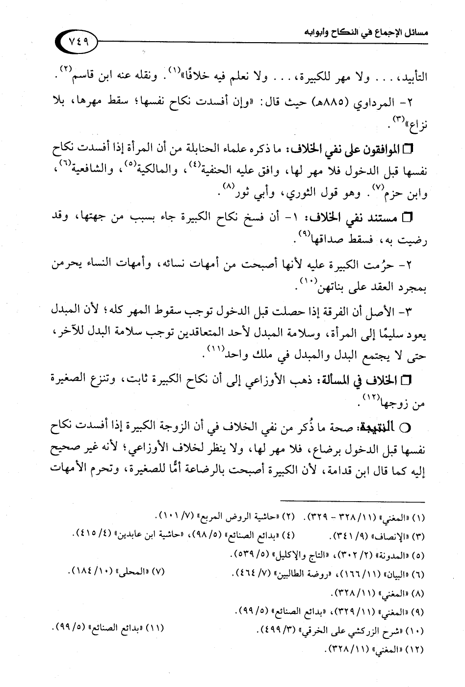 2 - المرداوي (885 هـ) حيث قال: "وإن أفسدت نكاح نفسها؛ سقط مهرها، بلا نزاع" (¬3).