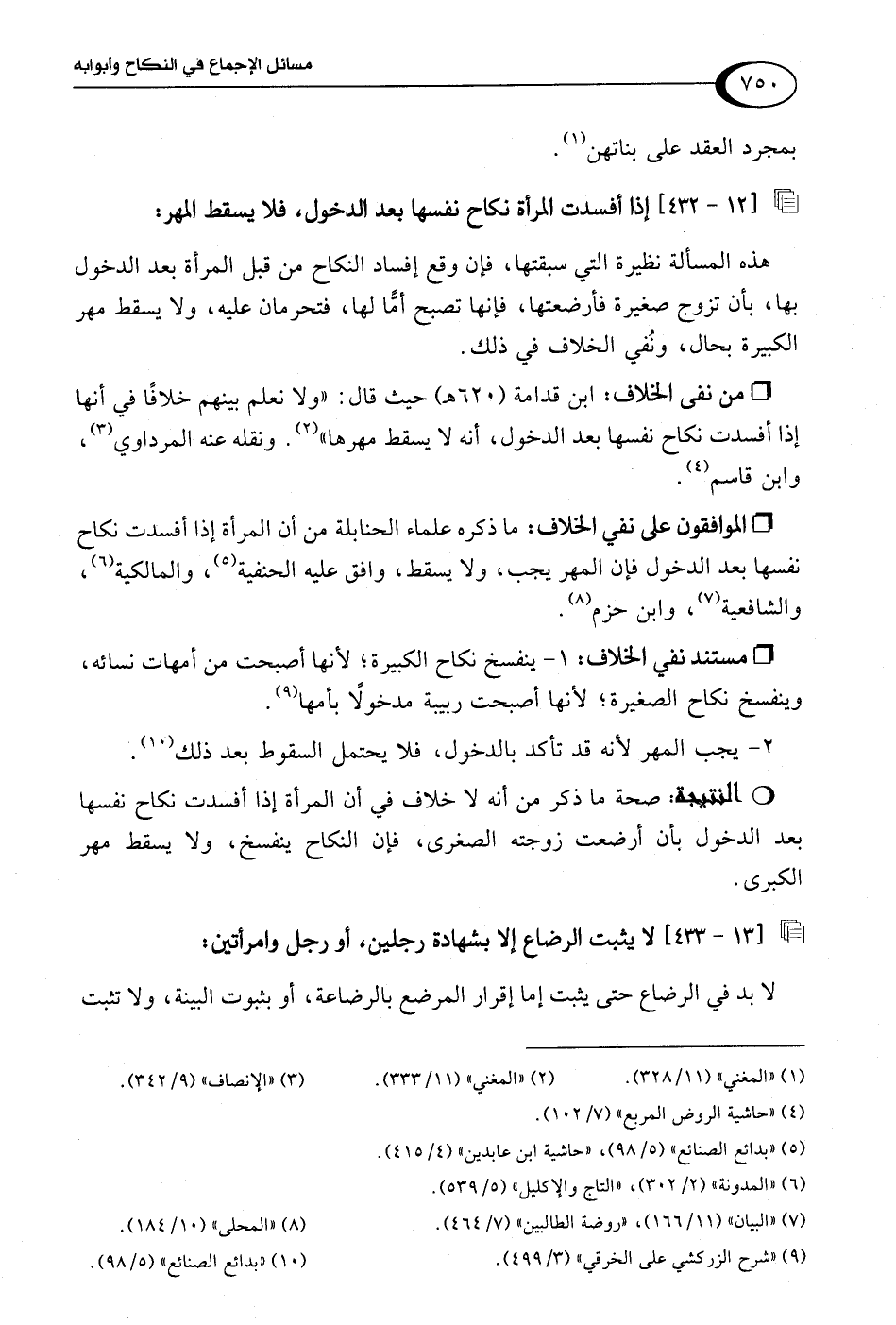 • الموافقون على نفي الخلاف: ما ذكره علماء الحنابلة من أن المرأة إذا أفسدت نكاح نفسها بعد الدخول فإن المهر يجب، ولا يسقط، وافق عليه الحنفية (¬5)، والمالكية (¬6)، والشافعية (¬7)، وابن حزم (¬8).