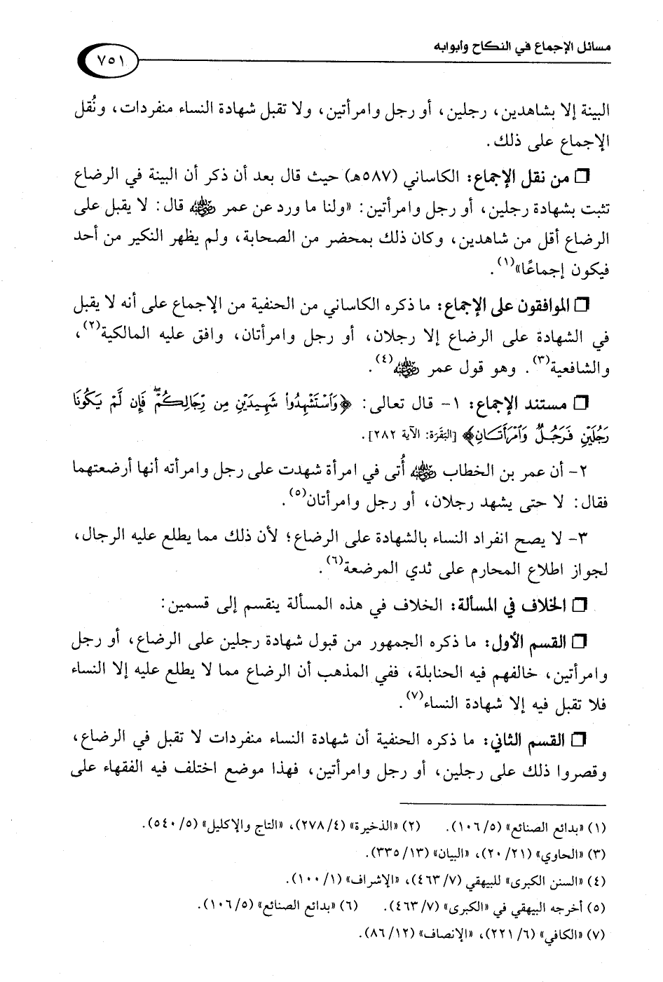 • من نقل الإجماع: الكاساني (587 هـ) حيث قال بعد أن ذكر أن البينة في الرضاع تثبت بشهادة رجلين، أو رجل وامرأتين: "ولنا ما ورد عن عمر -رضي اللَّه عنه- قال: لا يقبل على الرضاع أقل من شاهدين، وكان ذلك بمحضر من الصحابة، ولم يظهر النكير من أحد فيكون إجماعًا" (¬1).