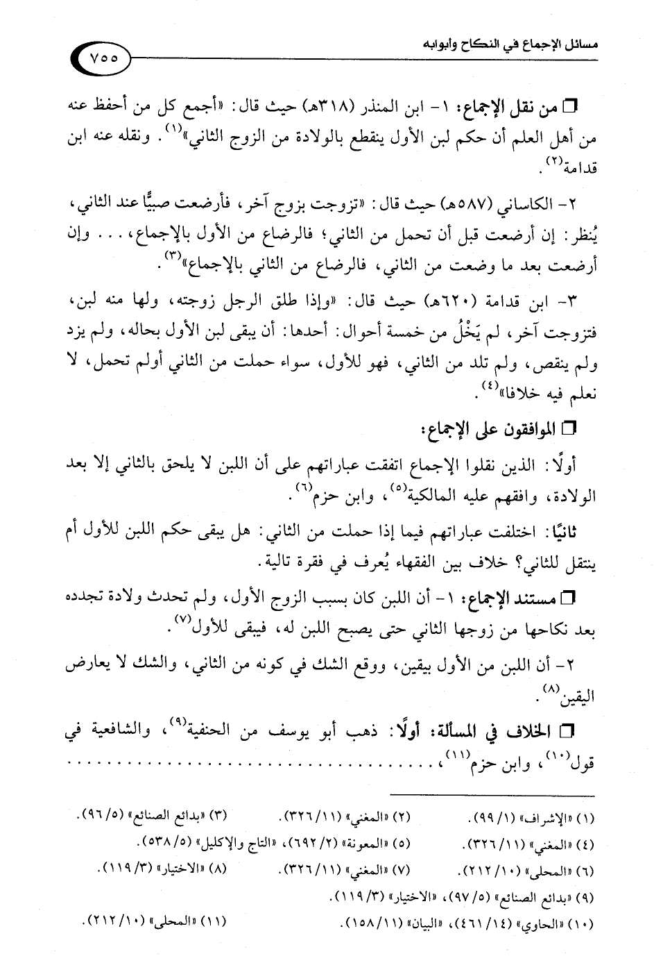 1 - ابن المنذر (318 هـ) حيث قال: "أجمع كل من أحفظ عنه من أهل العلم أن حكم لبن الأول ينقطع بالولادة من الزوج الثاني" (¬1). ونقله عنه ابن قدامة (¬2).