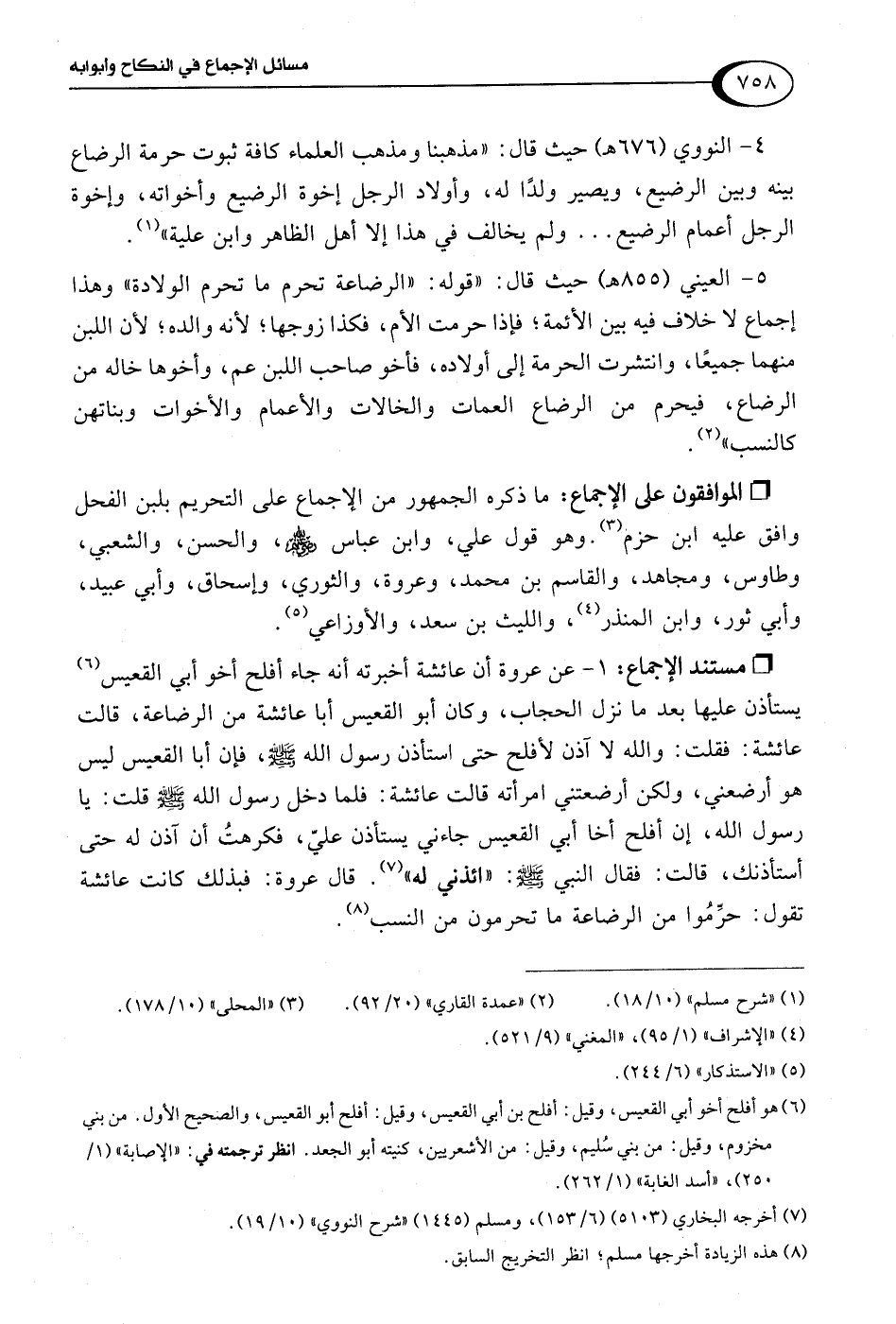 4 - النووي (676 هـ) حيث قال: "مذهبنا ومذهب العلماء كافة ثبوت حرمة الرضاع بينه وبين الرضيع، ويصير ولدًا له، وأولاد الرجل إخوة الرضيع وأخواته، وإخوة الرجل أعمام الرضيع. . . ولم يخالف في هذا إلا أهل الظاهر وابن علية" (¬1).