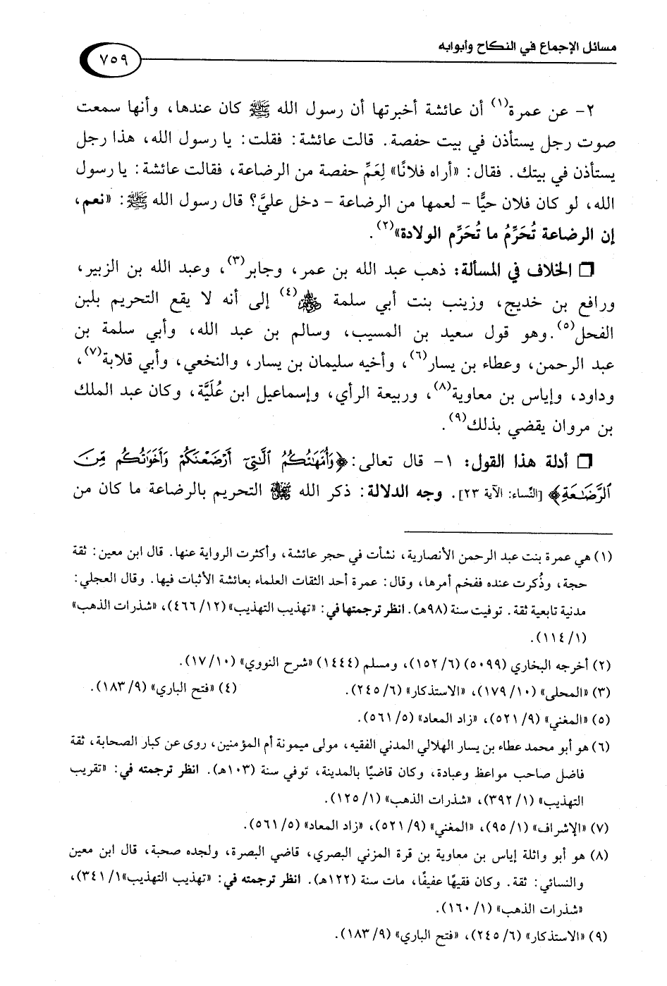 • الخلاف في المسألة: ذهب عبد اللَّه بن عمر، وجابر (¬3)، وعبد اللَّه بن الزبير، ورافع بن خديج، وزينب بنت أبي سلمة -رضي اللَّه عنهم- (¬4) إلى أنه لا يقع التحريم بلبن الفحل (¬5). وهو قول سعيد بن المسيب، وسالم بن عبد اللَّه، وأبي سلمة بن عبد الرحمن، وعطاء بن يسار (¬6)، وأخيه سليمان بن يسار، والنخعي، وأبي قلابة (¬7)، وداود، وإياس بن معاوية (¬8)، وربيعة الرأي، وإسماعيل ابن عُلَيَّة، وكان عبد الملك بن مروان يقضي بذلك (¬9).
