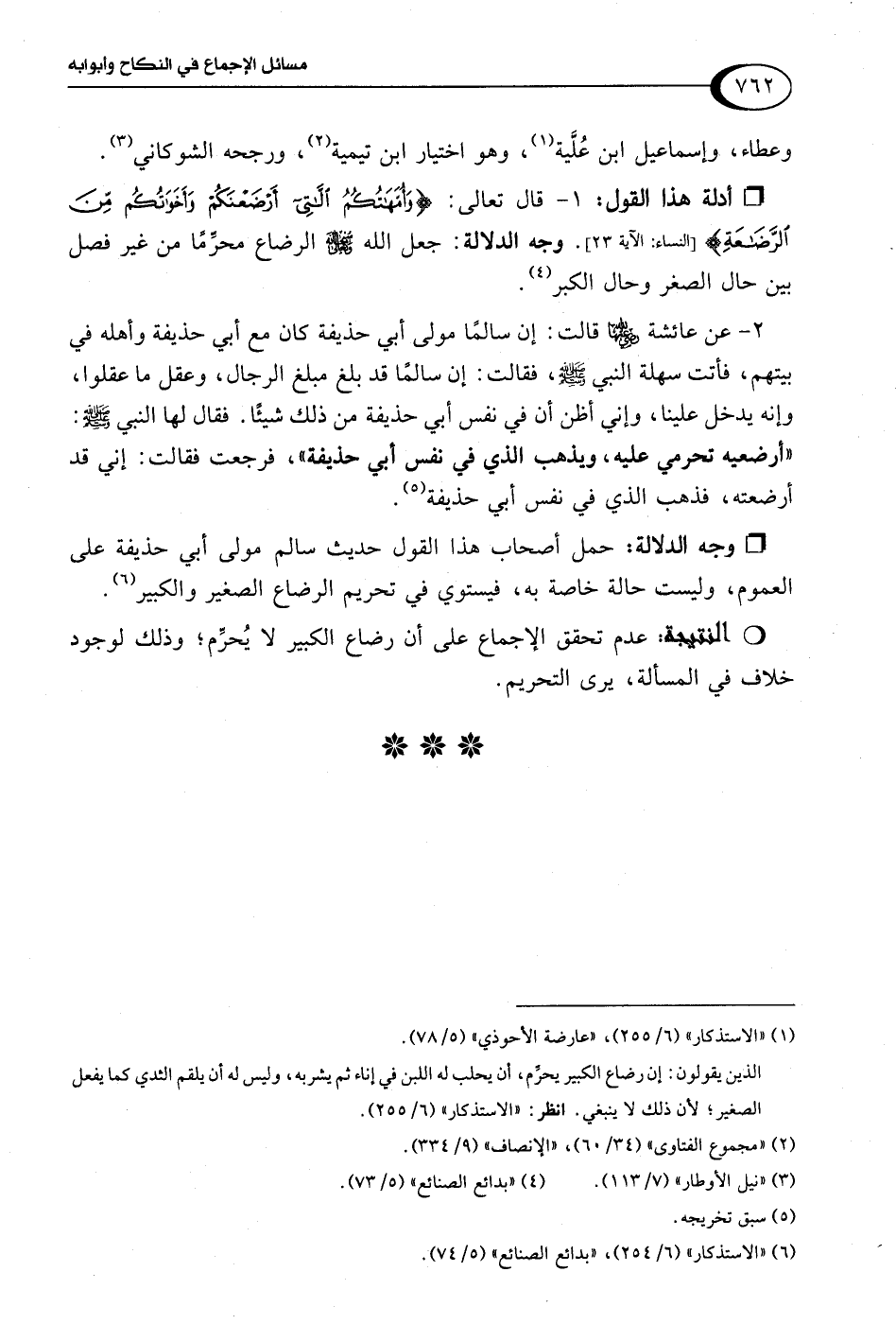 • وجه الدلالة: حمل أصحاب هذا القول حديث سالم مولى أبي حذيفة على العموم، وليست حالة خاصة به، فيستوي في تحريم الرضاع الصغير والكبير (¬6).Rعدم تحقق الإجماع على أن رضاع الكبير لا يُحرِّم؛ وذلك لوجود خلاف في المسألة، يرى التحريم.