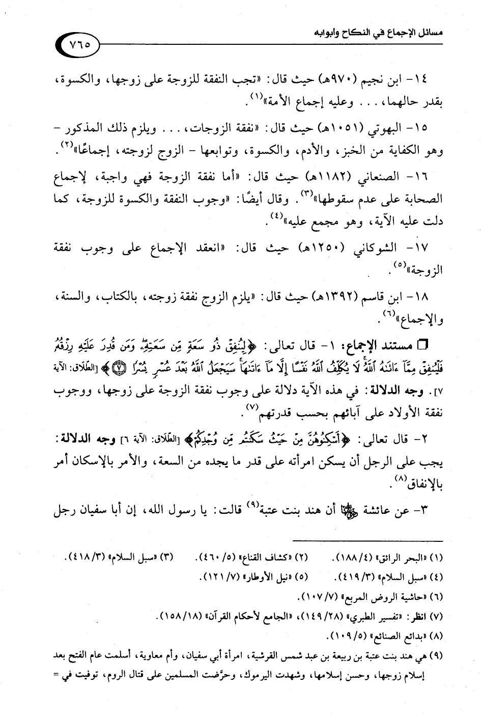 18 - ابن قاسم (1392 هـ) حيث قال: "يلزم الزوج نفقة زوجته، بالكتاب، والسنة، والإجماع" (¬6).