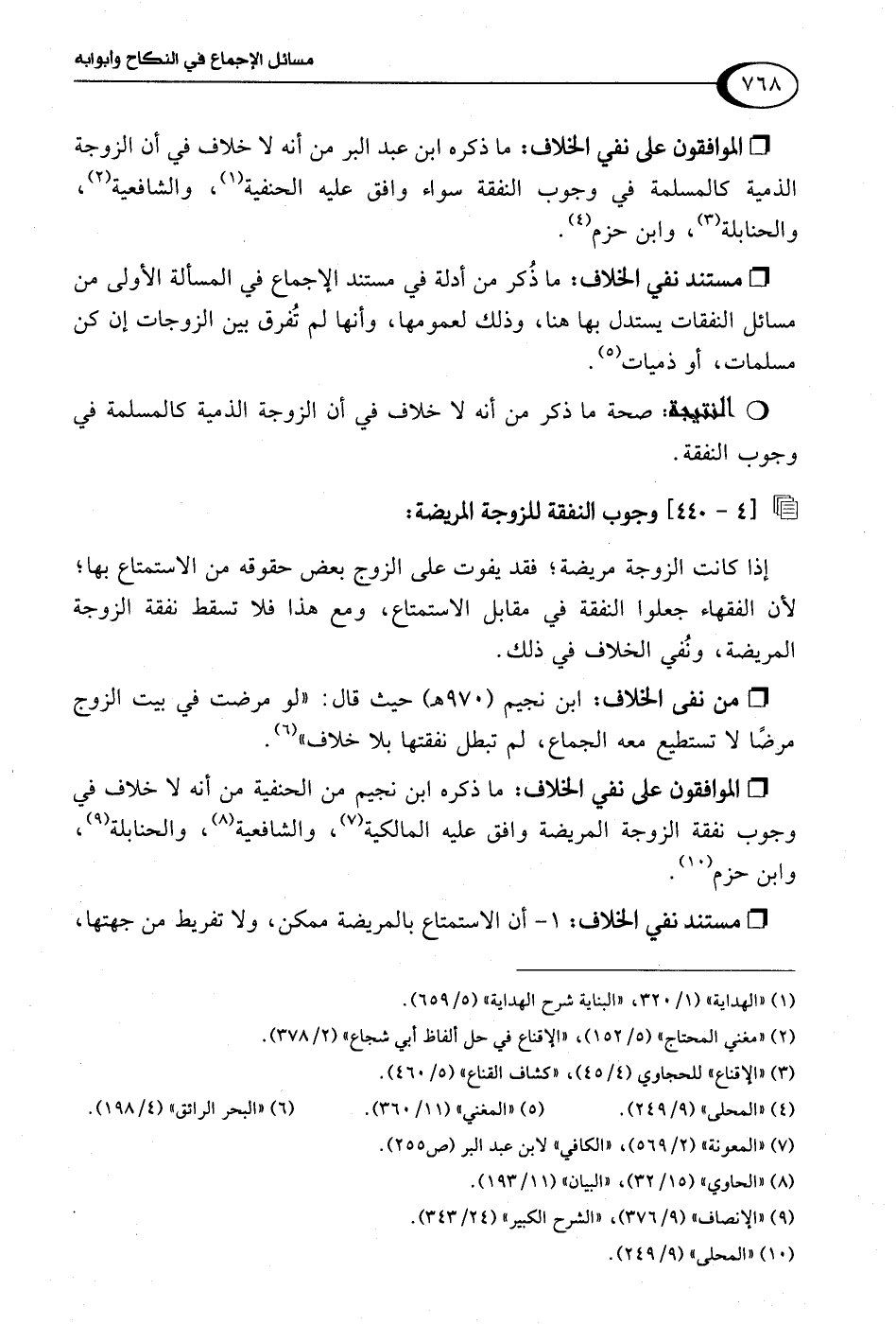 • الموافقون على نفي الخلاف: ما ذكره ابن نجيم من الحنفية من أنه لا خلاف في وجوب نفقة الزوجة المريضة وافق عليه المالكية (¬7)، والشافعية (¬8)، والحنابلة (¬9)، وابن حزم (¬10).