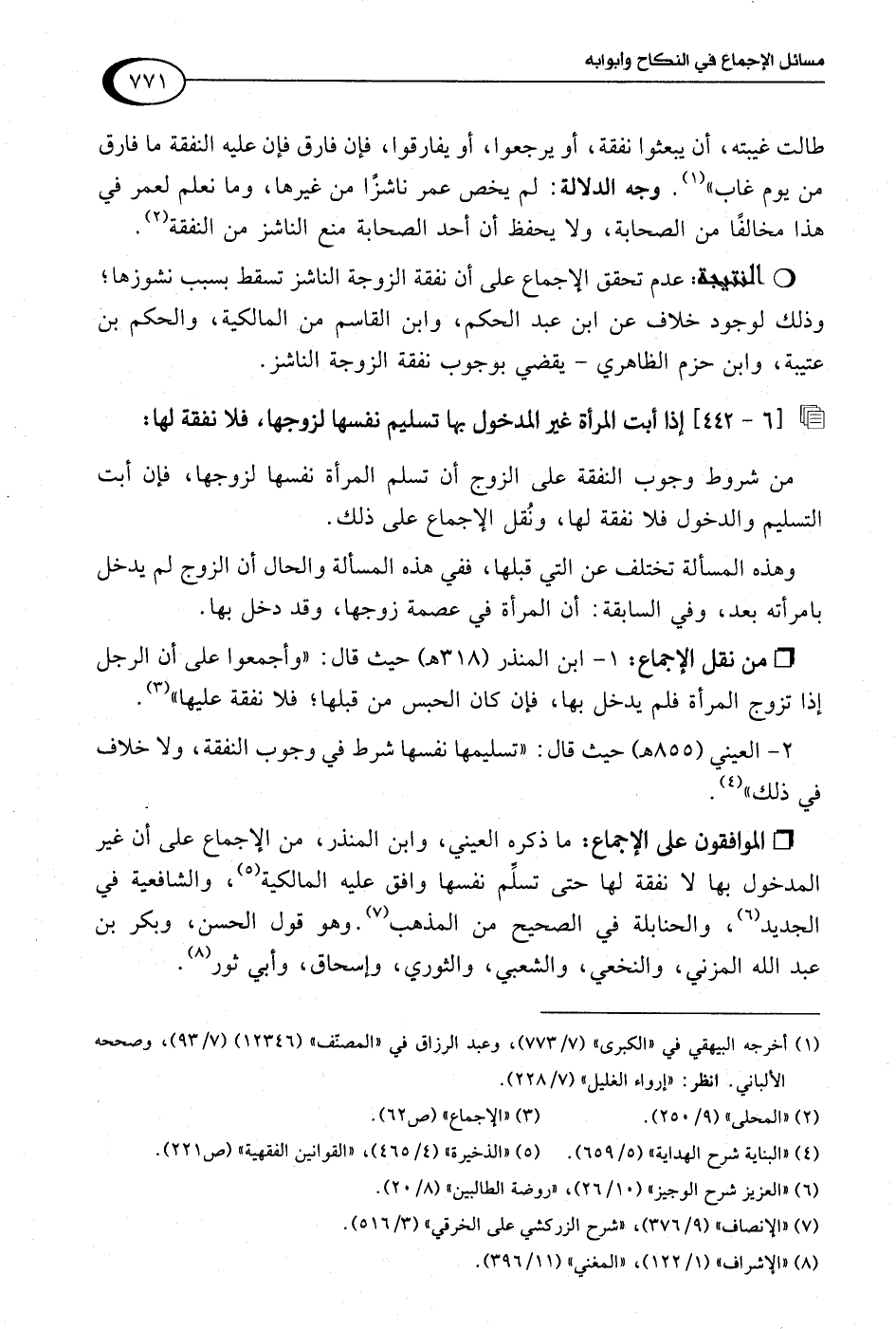 • وجه الدلالة: لم يخص عمر ناشزًا من غيرها، وما نعلم لعمر في هذا مخالفًا من الصحابة، ولا يحفظ أن أحد الصحابة منع الناشز من النفقة (¬2).Rعدم تحقق الإجماع على أن نفقة الزوجة الناشز تسقط بسبب نشوزها؛ وذلك لوجود خلاف عن ابن عبد الحكم، وابن القاسم من المالكية، والحكم بن عتيبة، وابن حزم الظاهري -يقضي بوجوب نفقة الزوجة الناشز.