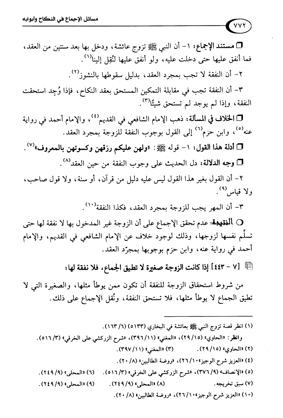 3 - أن المهر يجب للزوجة بمجرد العقد، فكذا النفقة (¬10).Rعدم تحقق الإجماع على أن الزوجة غير المدخول بها لا نفقة لها حتى تسلِّم نفسها لزوجها، وذلك لوجود خلاف عن الإمام الشافعي في القديم، والإمام أحمد في رواية عنه، وابن حزم بوجوبها بمجرّد العقد.