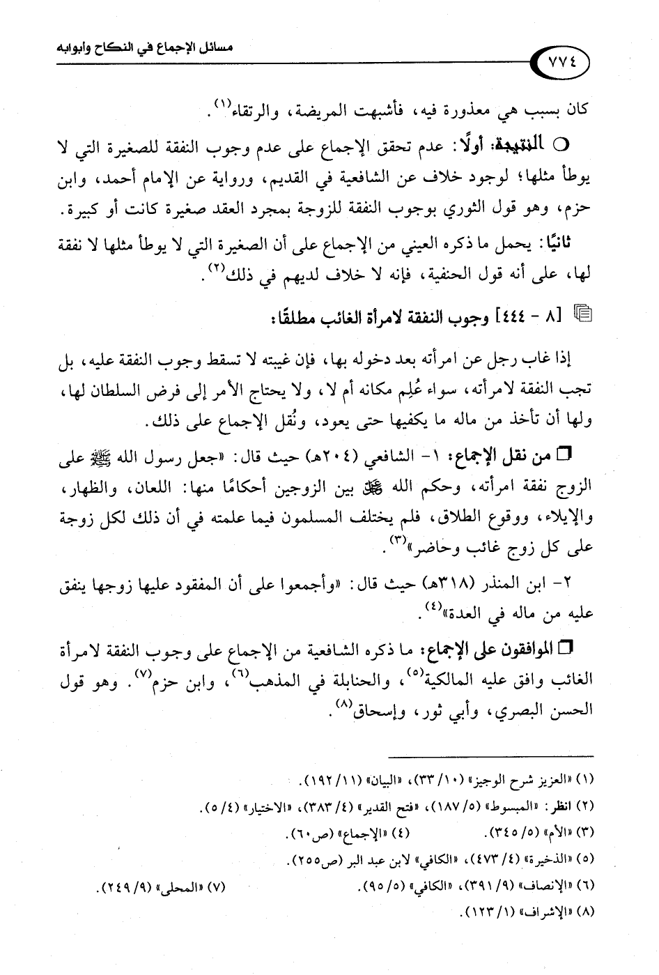 • الموافقون على الإجماع: ما ذكره الشافعية من الإجماع على وجوب النفقة لامرأة الغائب وافق عليه المالكية (¬5)، والحنابلة في المذهب (¬6)، وابن حزم (¬7). وهو قول الحسن البصري، وأبي ثور، وإسحاق (¬8).