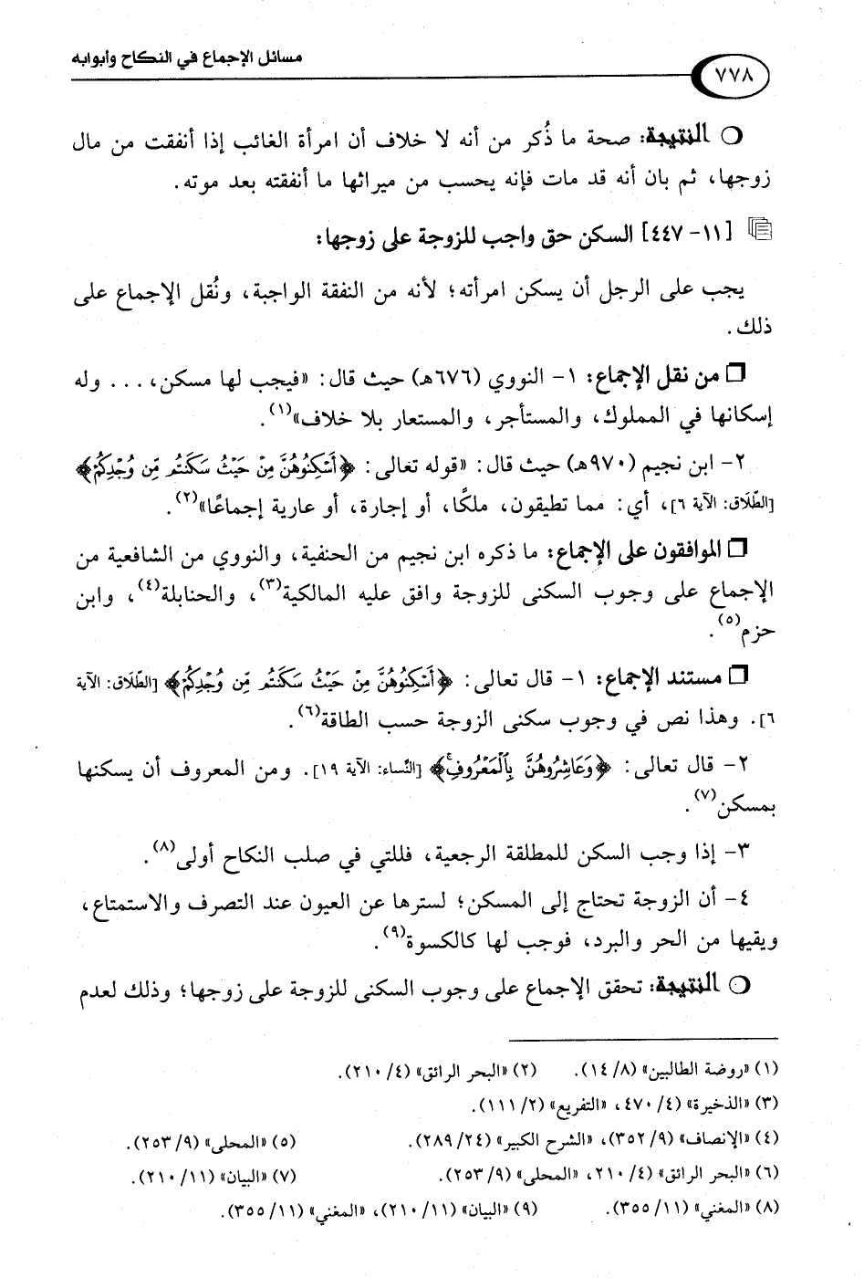 • الموافقون على الإجماع: ما ذكره ابن نجيم من الحنفية، والنووي من الشافعية من الإجماع على وجوب السكنى للزوجة وافق عليه المالكية (¬3)، والحنابلة (¬4)، وابن حزم (¬5).