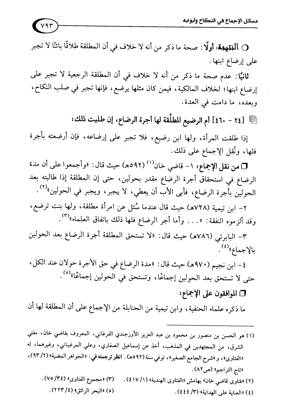 4 - ابن نجيم (970 هـ) حيث قال: "مدة الرضاع في حق الأجرة حولان عند الكل، حتى لا تستحق بعد الحولين إجماعًا، وتستحق في الحولين إجماعًا" (¬5).