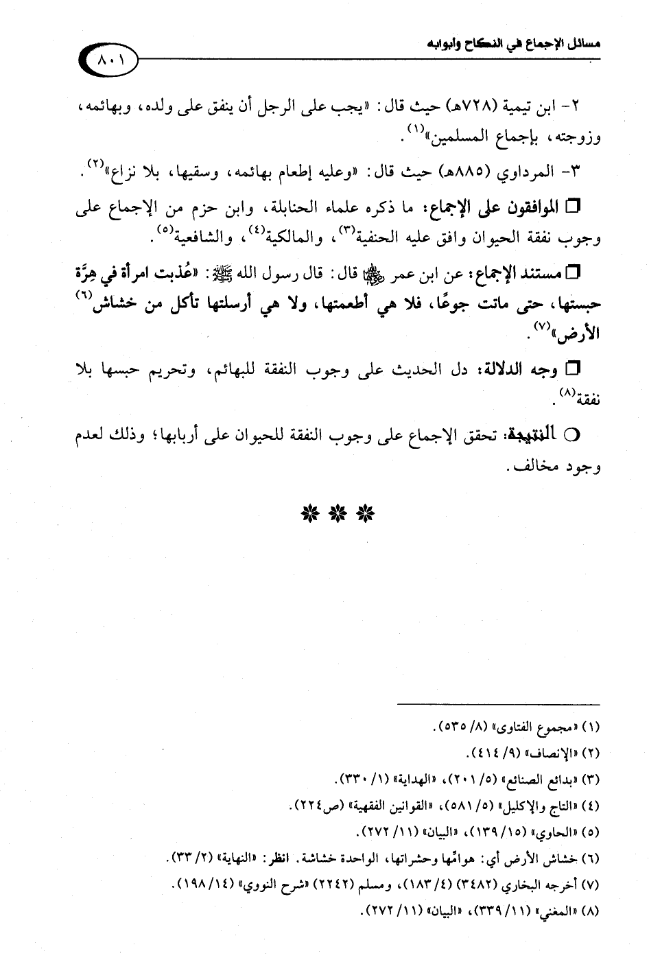 • الموافقون على الإجماع: ما ذكره علماء الحنابلة، وابن حزم من الإجماع على وجوب نفقة الحيوان وافق عليه الحنفية (¬3)، والمالكية (¬4)، والشافعية (¬5).
