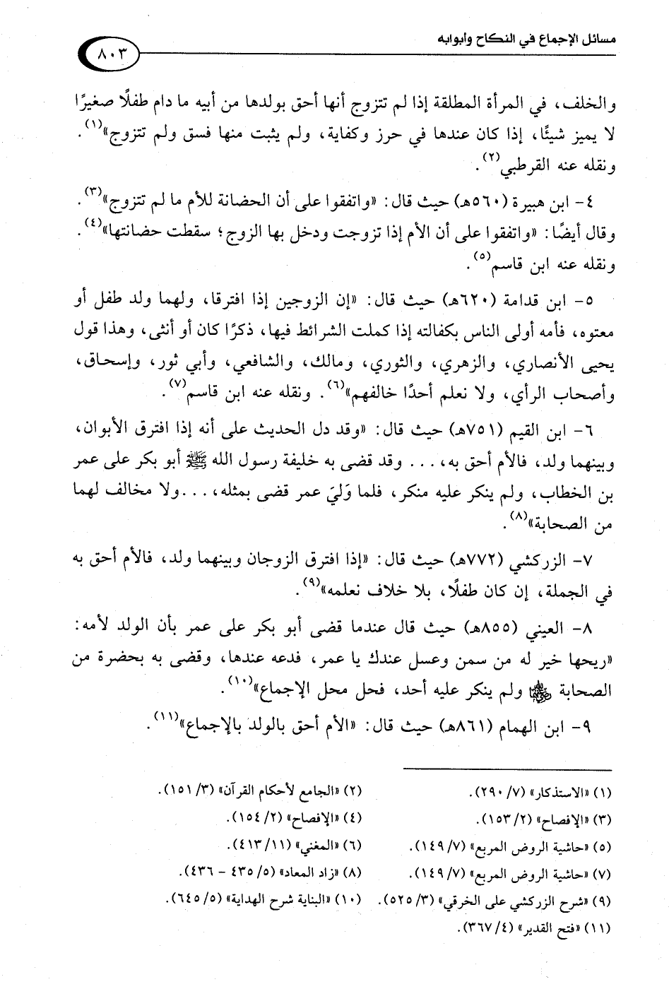 9 - ابن الهمام (861 هـ) حيث قال: "الأم أحق بالولد بالإجماع" (¬11).