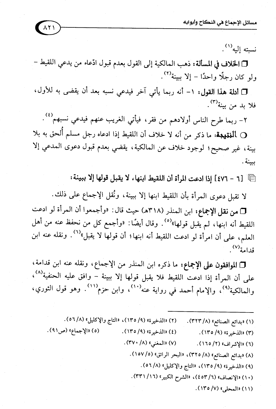• من نقل الإجماع: ابن المنذر (318 هـ) حيث قال: "وأجمعوا أن المرأة لو ادعت اللقيط أنه ابنها, لم يقبل قولها" (¬5). وقال أَيضًا: "وأجمع كل من نحفظ عنه من أهل العلم، على أن امرأة لو ادعت اللقيط أنه ابنها؛ أن قولها لا يقبل" (¬6). ونقله عنه ابن قدامة (¬7).
