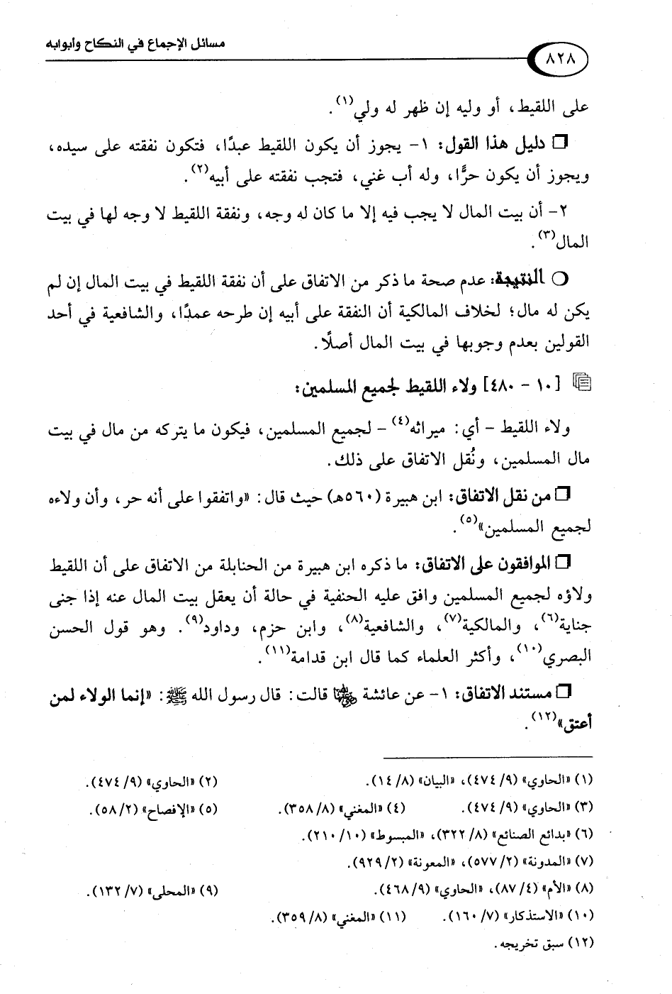 • الموافقون على الاتفاق: ما ذكره ابن هبيرة من الحنابلة من الاتفاق على أن اللقيط ولاؤه لجميع المسلمين وافق عليه الحنفية في حالة أن يعقل بيت المال عنه إذا جنى جناية (¬6)، والمالكية (¬7)، والشافعية (¬8)، وابن حزم، وداود (¬9). وهو قول الحسن البصري (¬10)، وأكثر العلماء كما قال ابن قدامة (¬11).