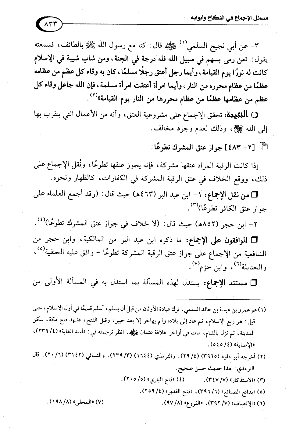 3 - عن أبي نجيح السلمي (¬1) -رضي اللَّه عنه- قال: كنا مع رسول اللَّه -صلى اللَّه عليه وسلم- بالطائف، فسمعته يقول: "من رمى بسهم في سبيل اللَّه فله درجة في الجنة، ومن شاب شيبة في الإسلام كانت له نورًا يوم القيامة، وأيما رجل أعتق رجلًا مسلمًا، كان به وقاء كل عظم من عظامه عظمًا من عظام محرره من النَّار، وأيما امرأة أعتقت امرأة مسلمة، فإن اللَّه جاعل وقاء كل عظم من عظامها عظمًا من عظام محررها من النَّار يوم القيامة" (¬2).Rتحقق الإجماع على مشروعية العتق، وأنه من الأعمال التي يتقرب بها إلى اللَّه سبحانه وتعالى، وذلك لعدم وجود مخالف.