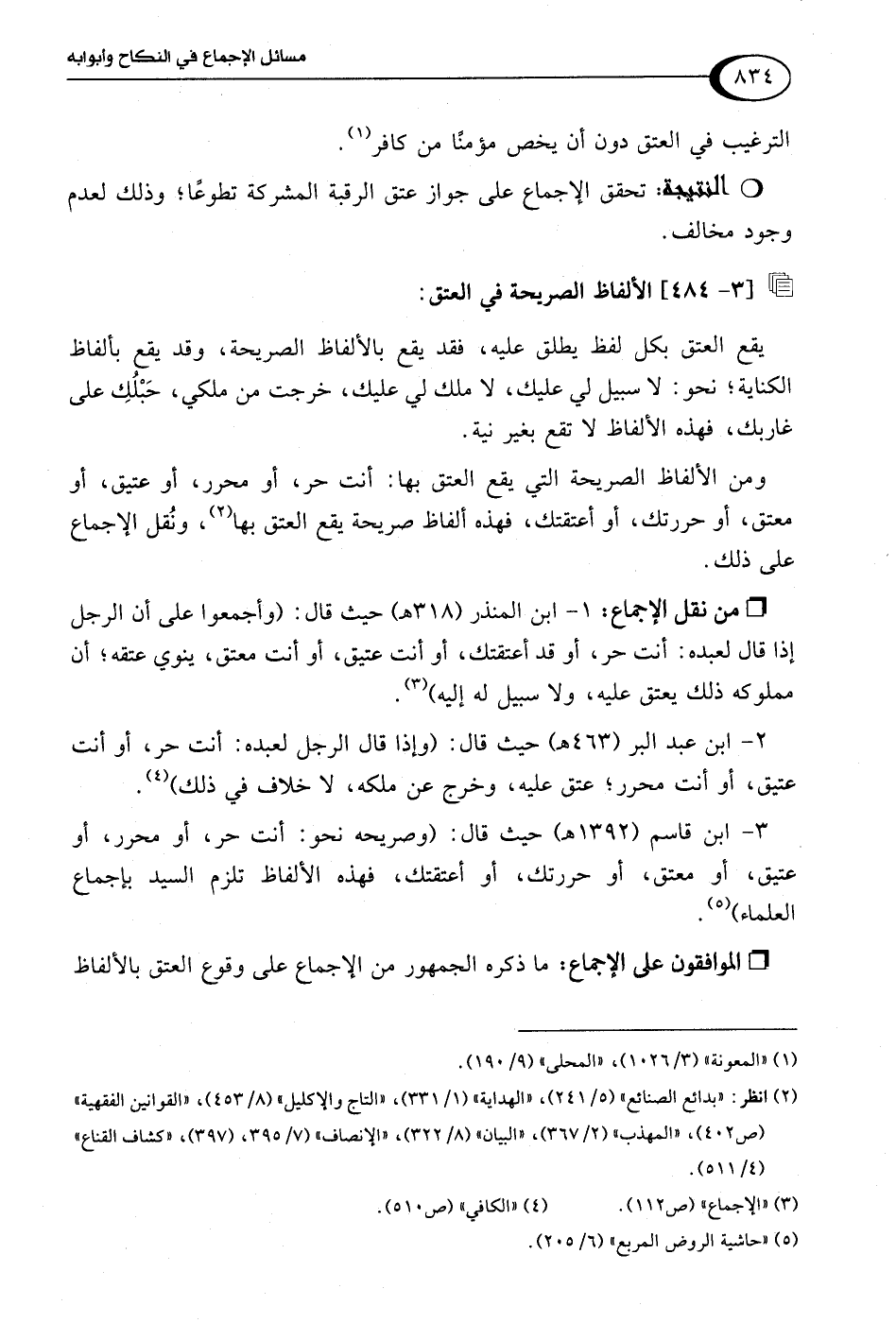 3 - ابن قاسم (1392 هـ) حيث قال: (وصريحه نحو: أَنْتَ حر، أو محرر، أو عتيق، أو معتق، أو حررتك، أو أعتقتك، فهذه الألفاظ تلزم السيد بإجماع العلماء) (¬5).