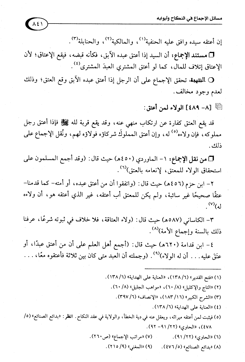 4 - ابن قدامة (620 هـ) حيث قال: (أجمع أهل العلم على أن من أعتق عبدًا، أو عتَقَ عليه. . . أن له الولاء) (¬9). (وجملته أن العبد متى كان بين ثلاثة فأعتقوه معًا،