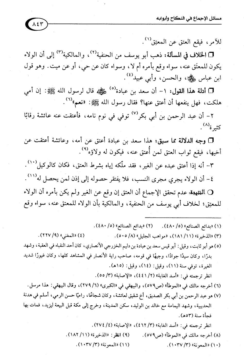 4 - أن الولاء يجري مجرى النسب، فلا يفتقر حصوله إلى إذن لمن يحصل له (¬11).Rعدم تحقق الإجماع أن العتق إن وقع عن الغير ولم يكن بأمره أن الولاء للمعتِق؛ لخلاف أبي يوسف من الحنفية، والمالكية بأن الولاء للمعتق عنه، سواء وقع
