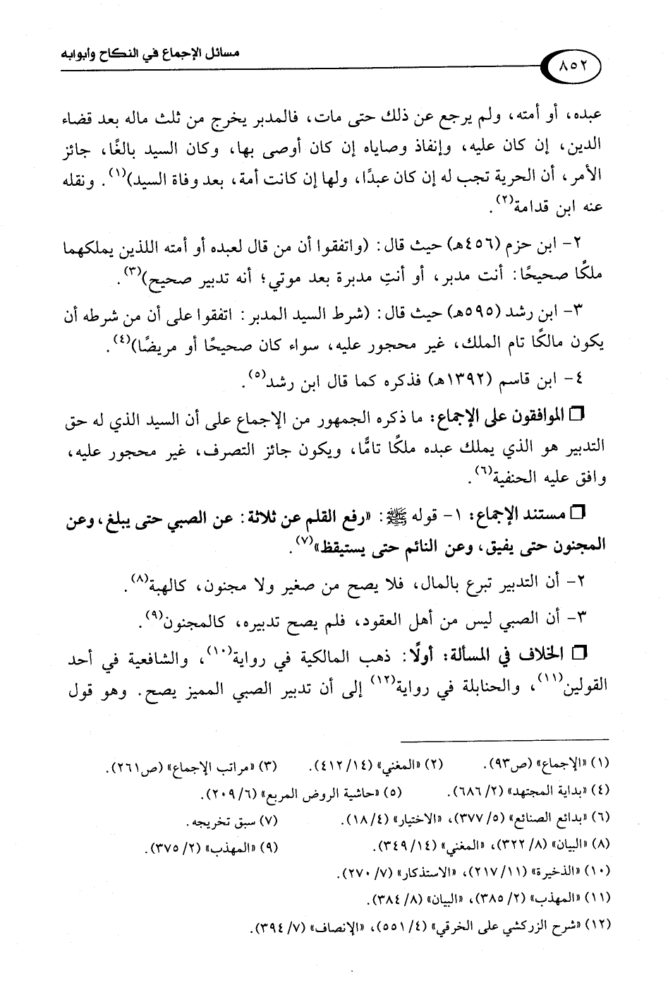 2 - ابن حزم (456 هـ) حيث قال: (واتفقوا أن من قال لعبده أو أمته اللذين يملكهما ملكًا صحيحًا: أَنْتَ مدبر، أو أنتِ مدبرة بعد موتي؛ أنه تدبير صحيح) (¬3).