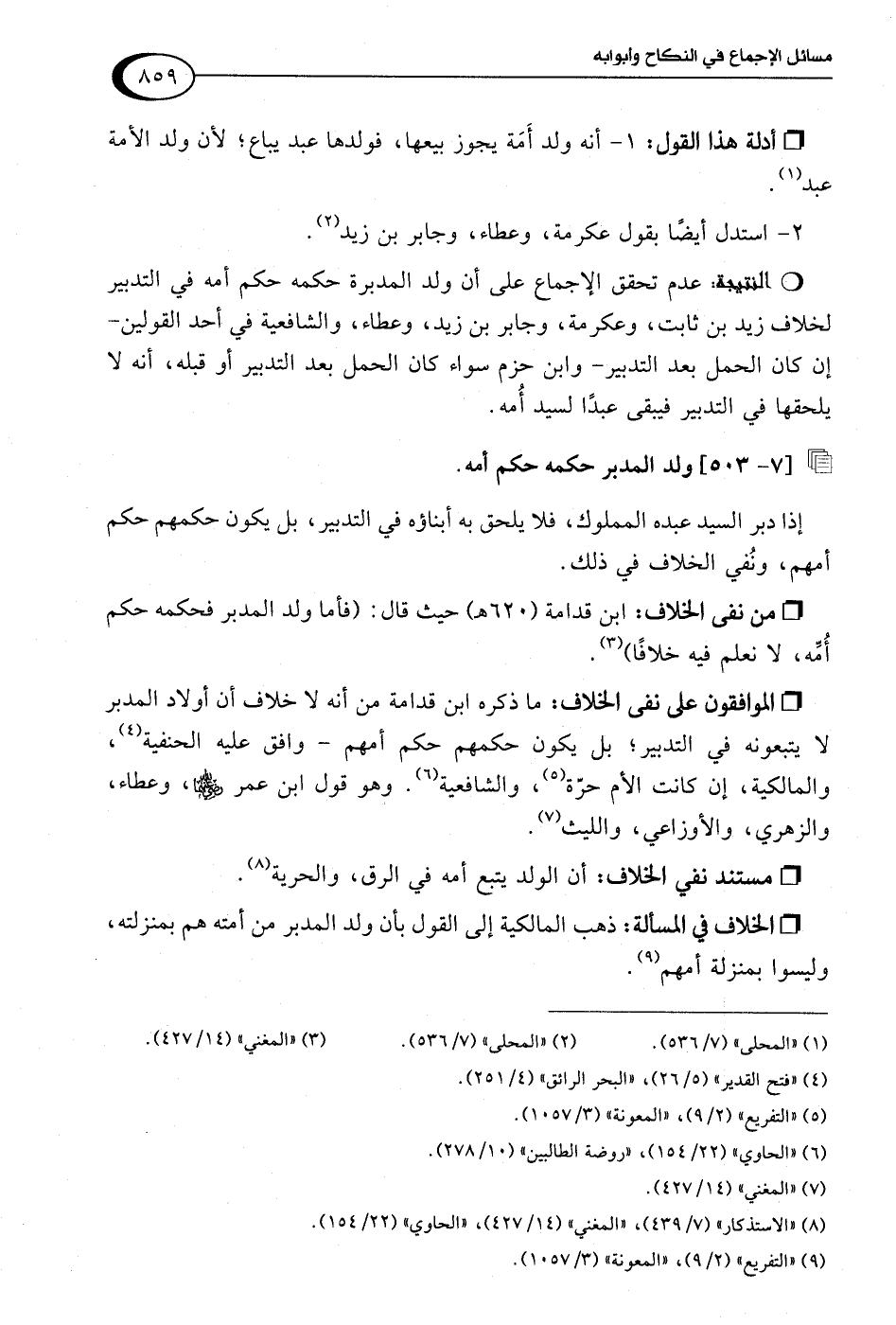 • من نفى الخلاف: ابن قدامة (620 هـ) حيث قال: (فأما ولد المدبر فحكمه حكم أُمِّه، لا نعلم فيه خلافًا) (¬3).