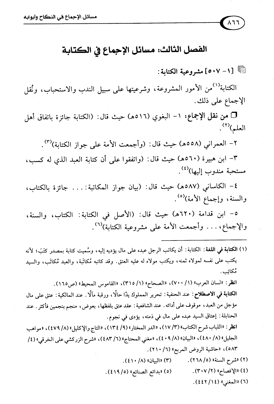 5 - ابن قدامة (620 هـ) حيث قال: (الأصل في الكتابة: الكتاب، والسنة، والإجماع، . . . وأجمعت الأمة على مشروعية الكتابة) (¬6).