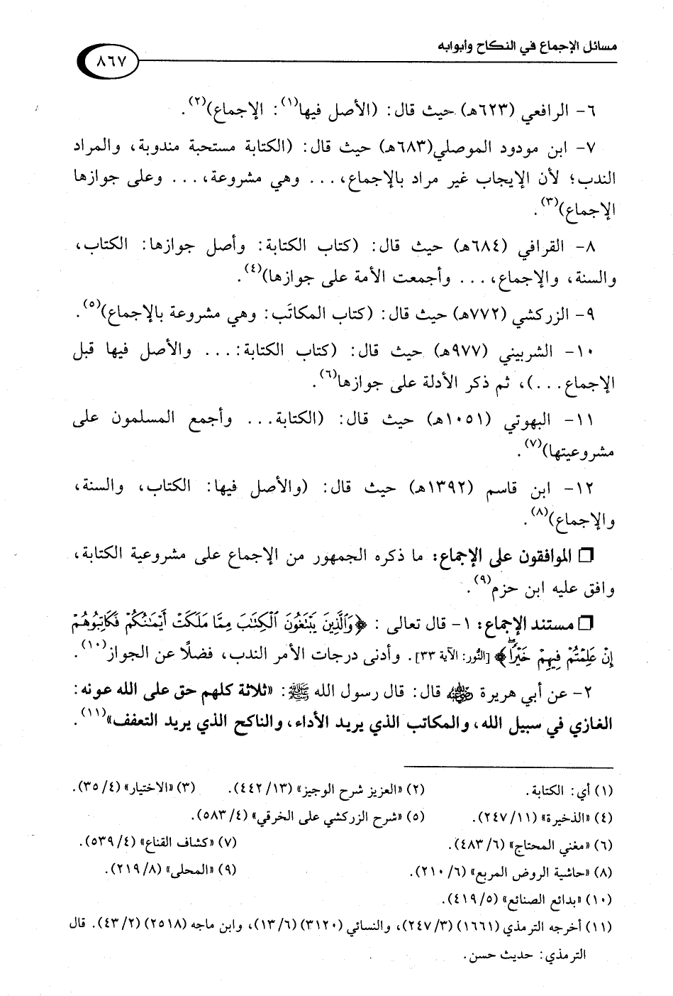 8 - القرافي (684 هـ) حيث قال: (كتاب الكتابة: وأصل جوازها: الكتاب، والسنة، والإجماع، . . . وأجمعت الأمة على جوازها) (¬4).