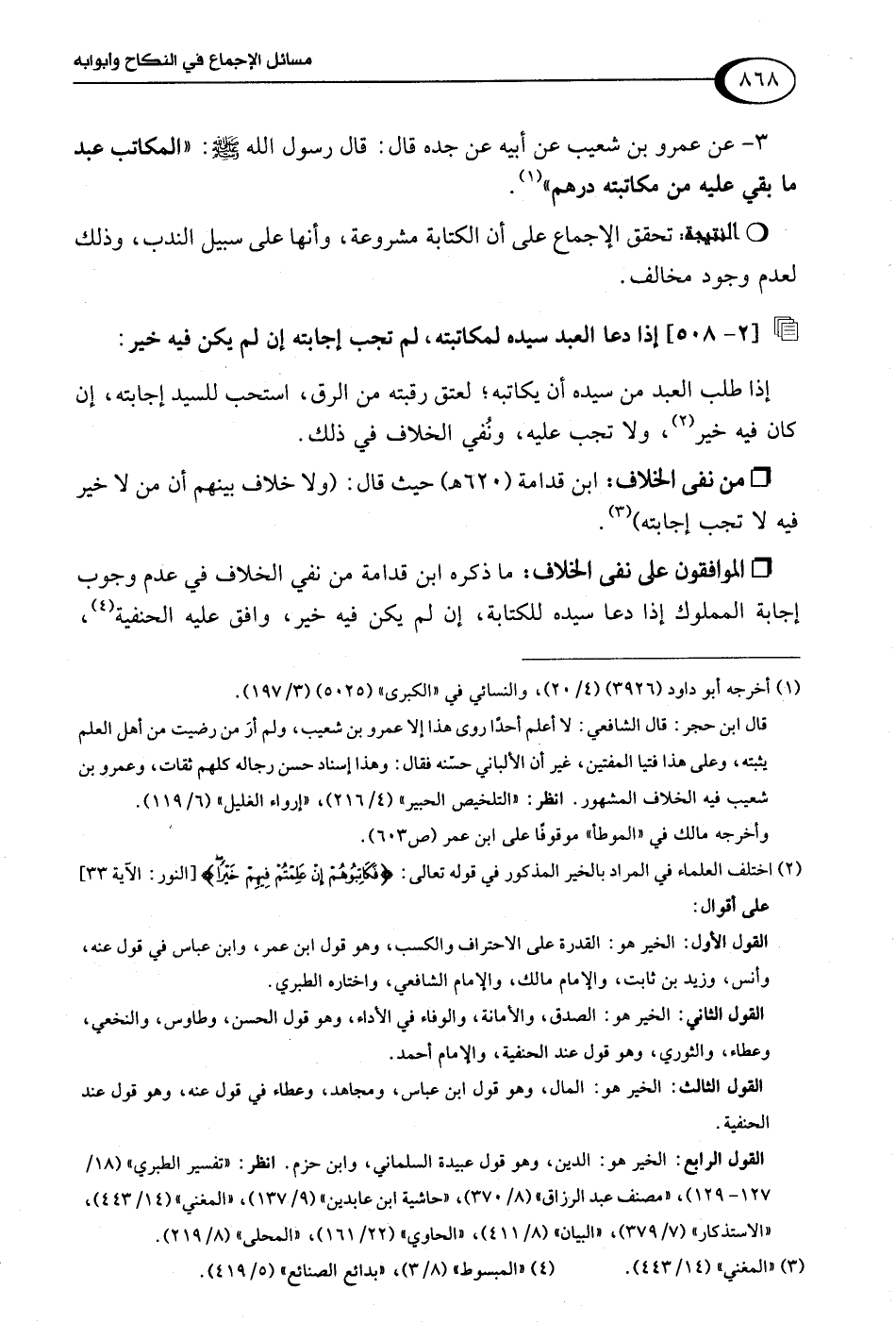 3 - عن عمرو بن شعيب عن أبيه عن جده قال: قال رسول اللَّه -صلى اللَّه عليه وسلم-: "المكاتب عبد ما بقي عليه من مكاتبته درهم" (¬1).Rتحقق الإجماع على أن الكتابة مشروعة، وأنها على سبيل الندب، وذلك لعدم وجود مخالف.