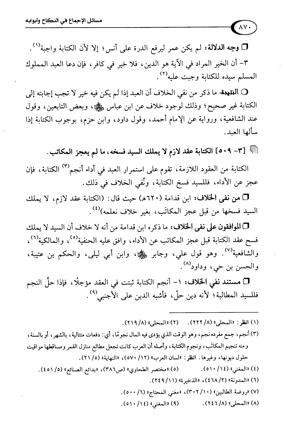 • من نفى الخلاف: ابن قدامة (620 هـ) حيث قال: (الكتابة عقد لازم، لا يملك السيد فسخها من قبل عجز المكاتَب، بغير خلاف نعلمه) (¬4).