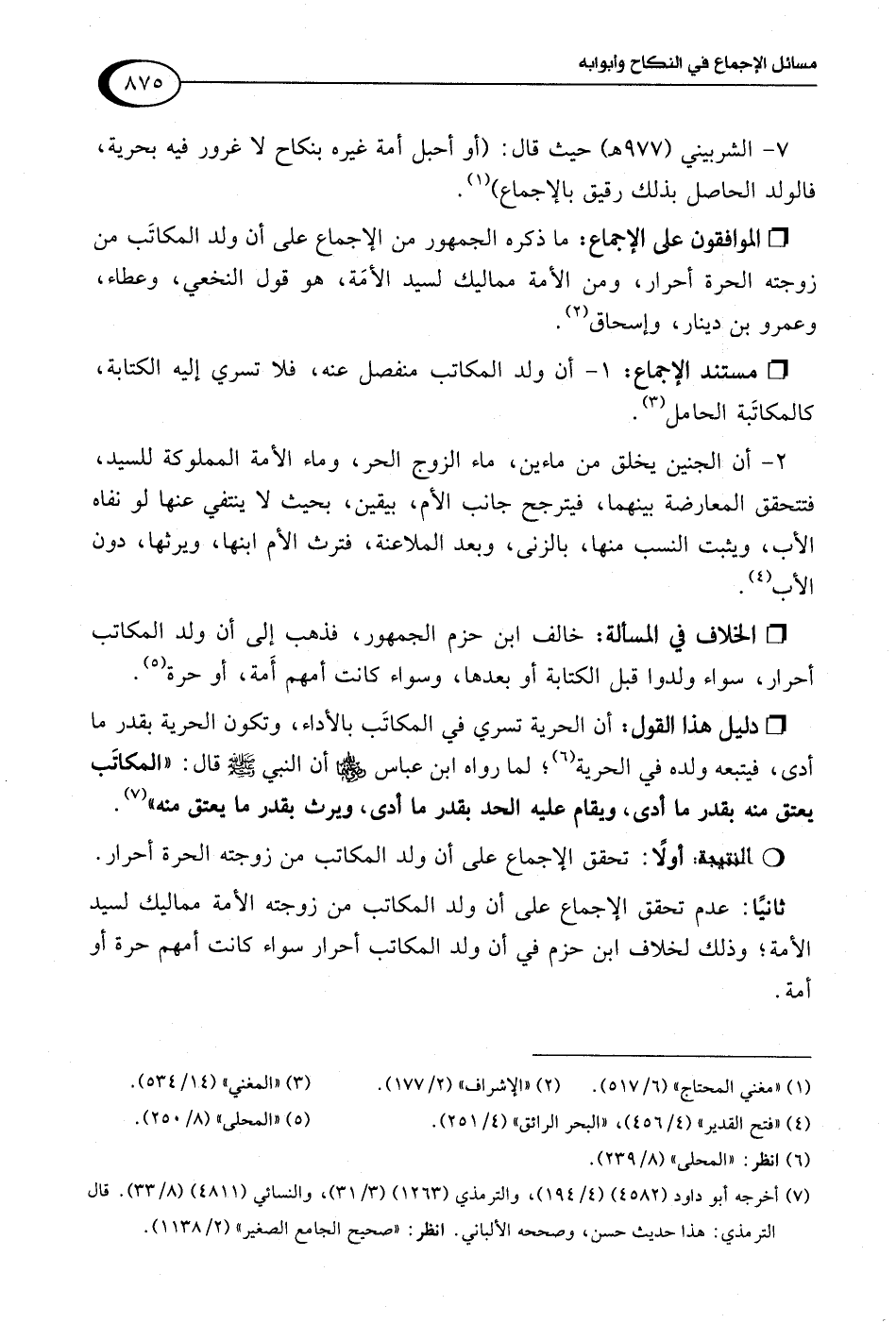 • دليل هذا القول: أن الحرية تسري في المكاتَب بالأداء، وتكون الحرية بقدر ما أدى، فيتبعه ولده في الحرية (¬6)، لما رواه ابن عباس -رضي اللَّه عنهما- أن النبي -صلى اللَّه عليه وسلم- قال: "المكاتَب يعتق منه بقدر ما أدى، ويقام عليه الحد بقدر ما أدى، ويرث بقدر ما يعتق منه" (¬7).Rأولًا: تحقق الإجماع على أن ولد المكاتب من زوجته الحرة أحرار.