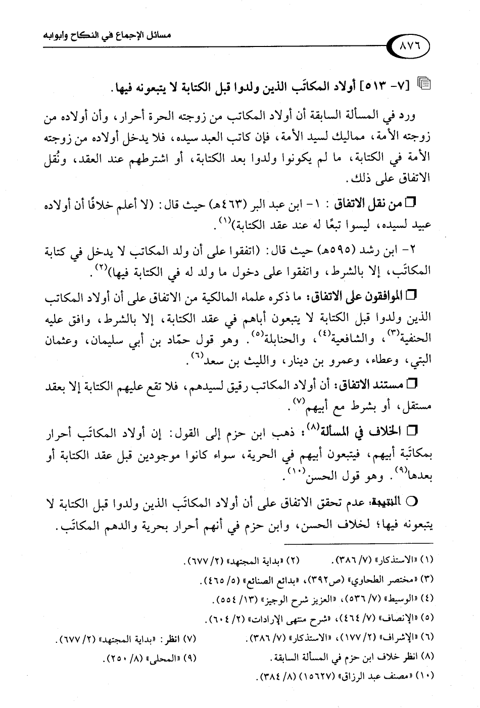2 - ابن رشد (595 هـ) حيث قال: (اتفقوا على أن ولد المكاتب لا يدخل في كتابة المكاتَب، إلا بالشرط، واتفقوا على دخول ما ولد له في الكتابة فيها) (¬2).