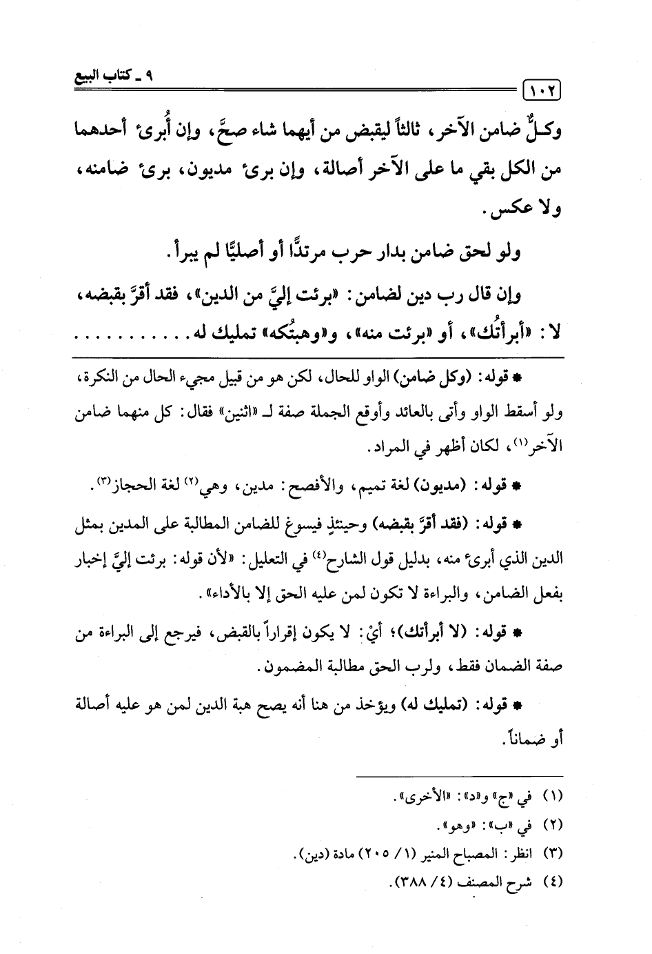 وإن قال رب دين لضامن: "برئت إليَّ من الدين"، فقد أقرَّ بقبضه، لا: "أبرأتُك"، أو "برئت منه"، و"وهبتُكه" تمليك له. . . . . .