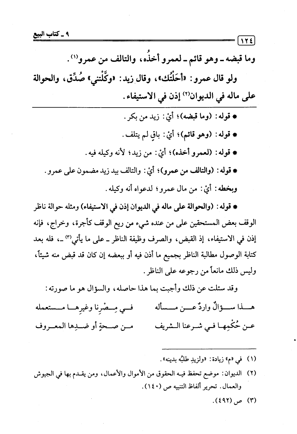 * قوله: (والحوالة على ماله في الديوان إذن في الاستيفاء) ومثله حوالة ناظر الوقف بعض المستحقين على من عنده شيء من ريع الوقف كأجرة، وخراج، فإنه إذن في الاستيفاء، إذ القبض، والصرف وظيفة الناظر -على ما يأتي (¬3) -، فله بعد كتابة الوصول مطالبة الناظر بجميع ما أذن فيه أو ببعضه إن كان قد قبض منه شيئًا، وليس ذلك مانعًا من رجوعه على الناظر.