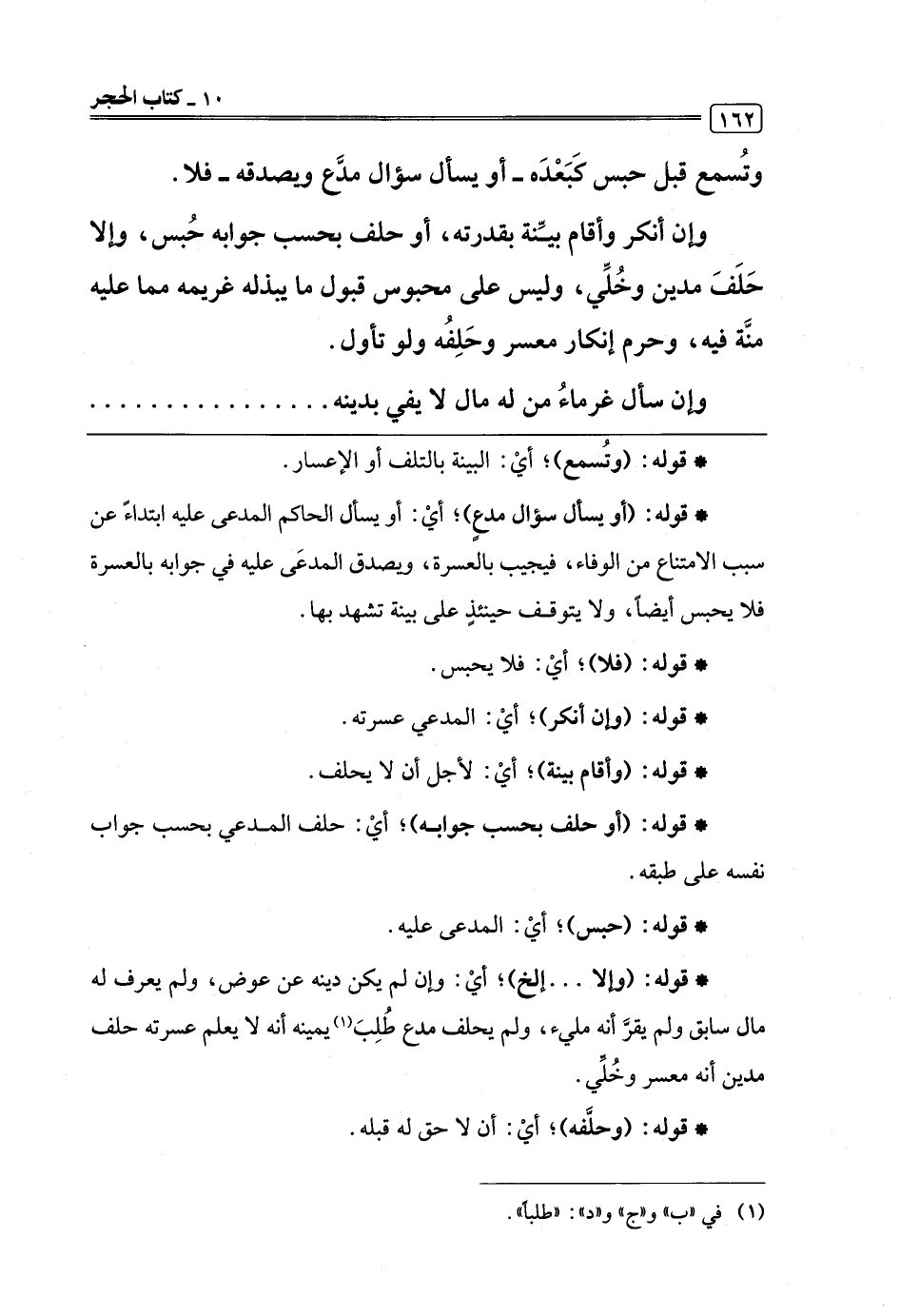 * قوله: (أو يسأل سؤال مدعٍ)؛ أيْ: أو يسأل الحاكم المدعى عليه ابتداءً عن سبب الامتناع من الوفاء، فيجيب بالعسرة، ويصدق المدعَى عليه في جوابه بالعسرة فلا يحبس أيضًا، ولا يتوقف حينئذٍ على بينة تشهد بها.