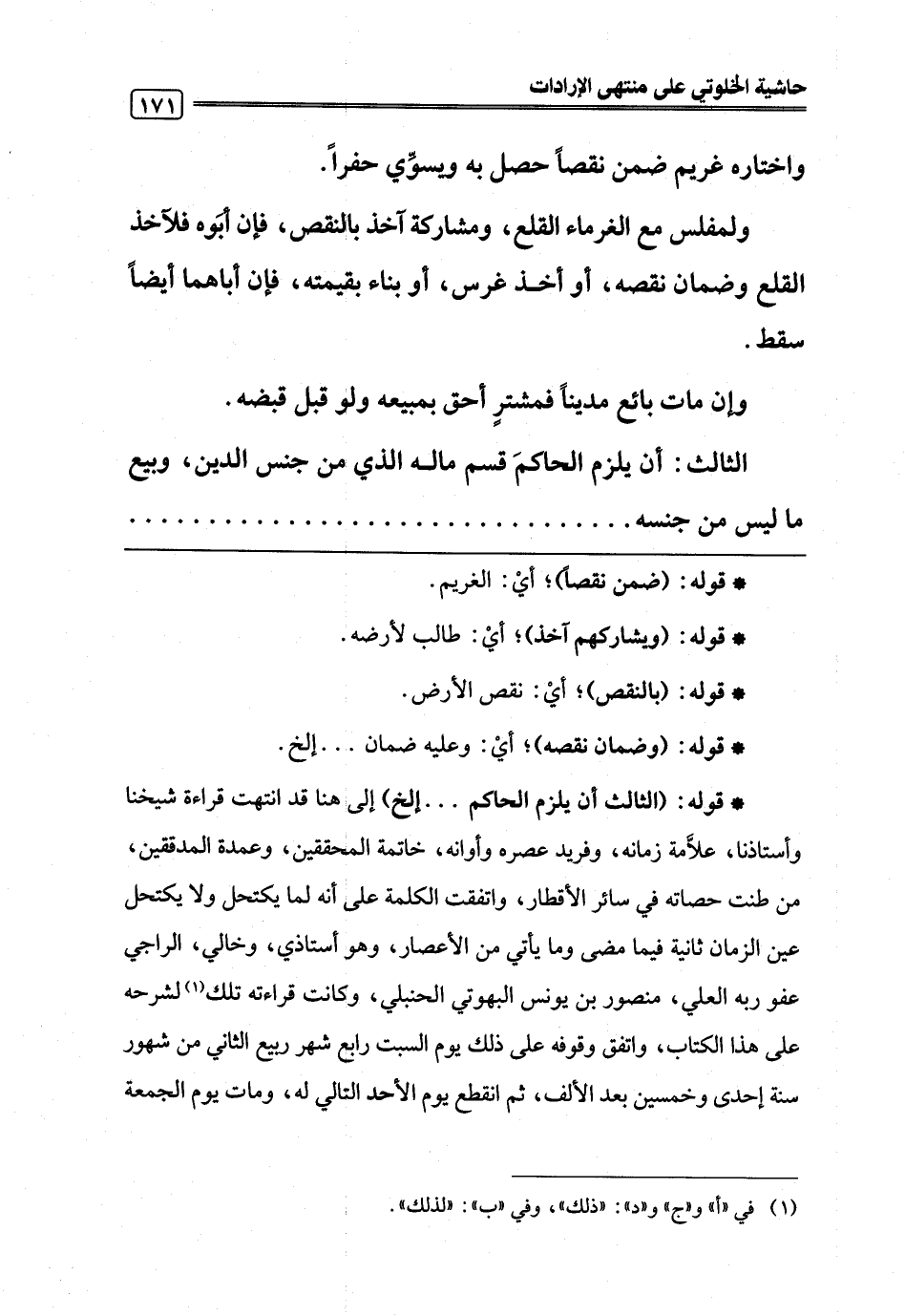 * قوله: (الثالث أن يلزم الحاكم. . . إلخ) إلى هنا قد انتهت قراءة شيخنا وأستاذنا، علَّامة زمانه، وفريد عصره وأوانه، خاتمة المحققين، وعمدة المدققين، من طنت حصاته في سائر الأقطار، واتفقت الكلمة على أنه لما يكتحل ولا يكتحل عين الزمان ثانية فيما مضى وما يأتي من الأعصار، وهو أستاذي، وخالي، الراجي عفو ربه العلي، منصور بن يونس البهوتي الحنبلي، وكانت قراءته تلك (¬1) لشرحه على هذا الكتاب، واتفق وقوفه على ذلك يوم السبت رابع شهر ربيع الثاني من شهور سنة إحدى وخمسين بعد الألف، ثم انقطع يوم الأحد التالي له، ومات يوم الجمعة