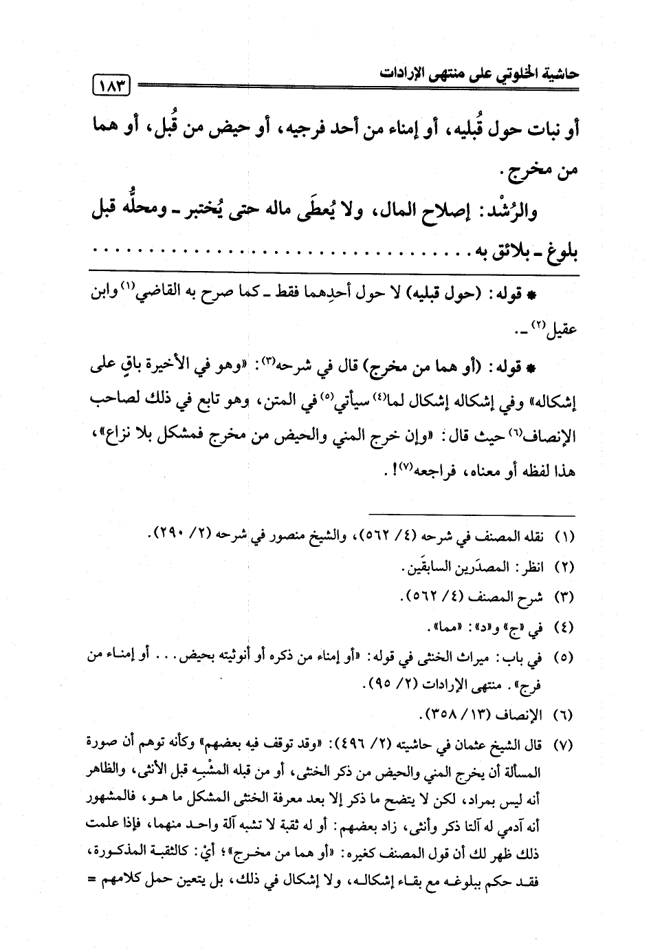 (¬5) في باب: ميراث الخنثى في قوله: "أو إمناء من ذكره أو أنوثيته بحيض. . . أو إمناء من فرج". منتهى الإرادات (2/ 95).