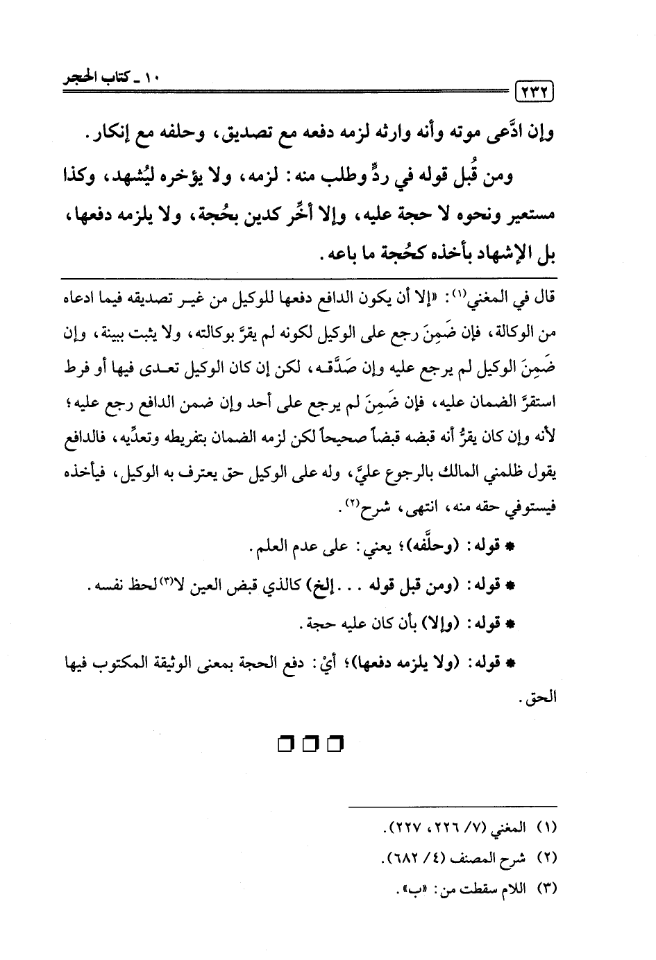 ومن قُبل قوله في ردٍّ وطلب منه: لزمه، ولا يؤخره ليُشهد، وكذا مستعير ونحوه لا حجة عليه، وإلا أخِّر كدين بحُجة، ولا يلزمه دفعها، بل الإشهاد بأخذه كحُجة ما باعه.