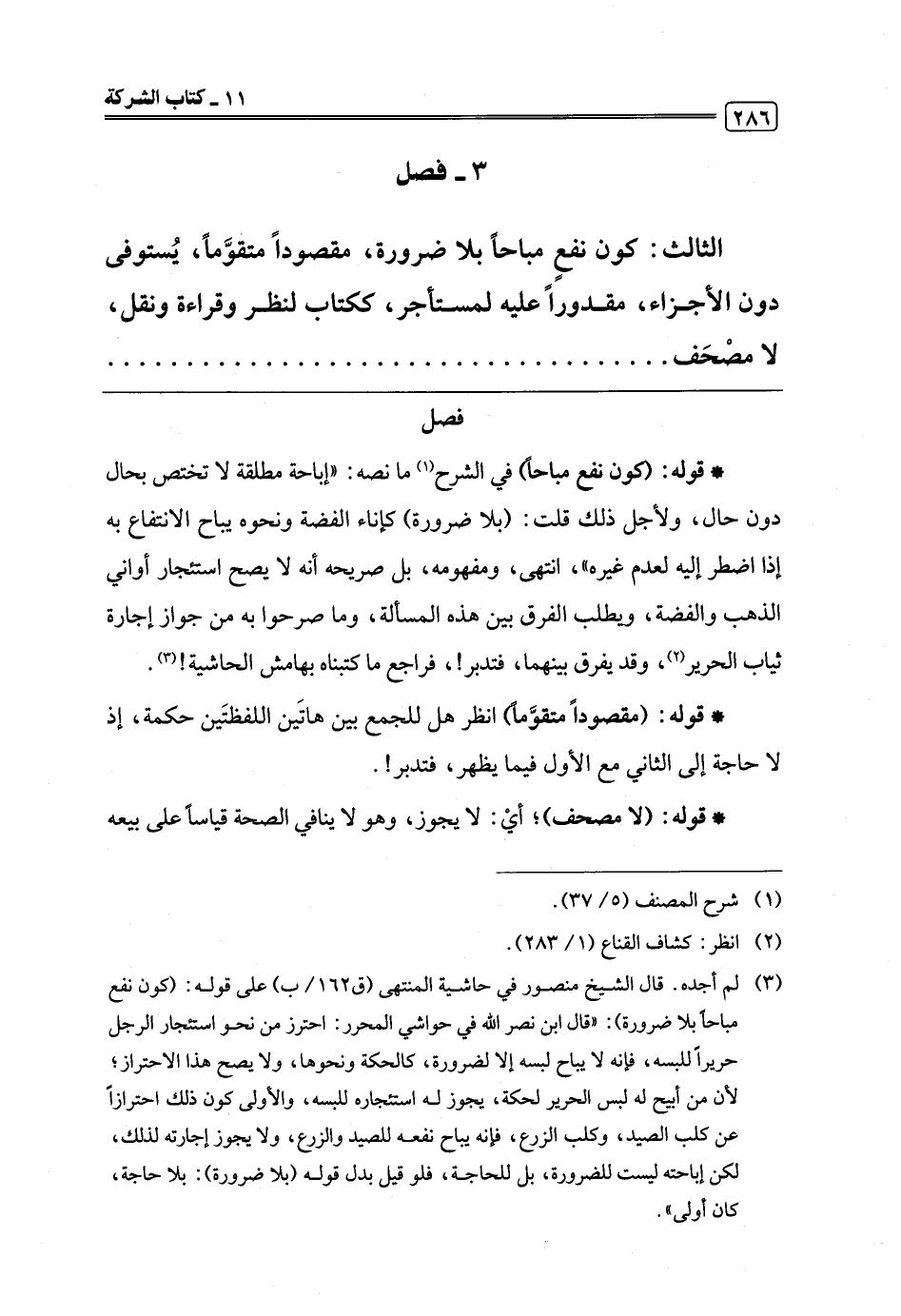 الثالث: كون نفعٍ مباحًا بلا ضرورة، مقصودًا متقوَّمًا، يُستوفى دون الأجزاء، مقدورًا عليه لمستأجر، ككتاب لنظر وقراءة ونقل، لا مصْحَف. . . . . .