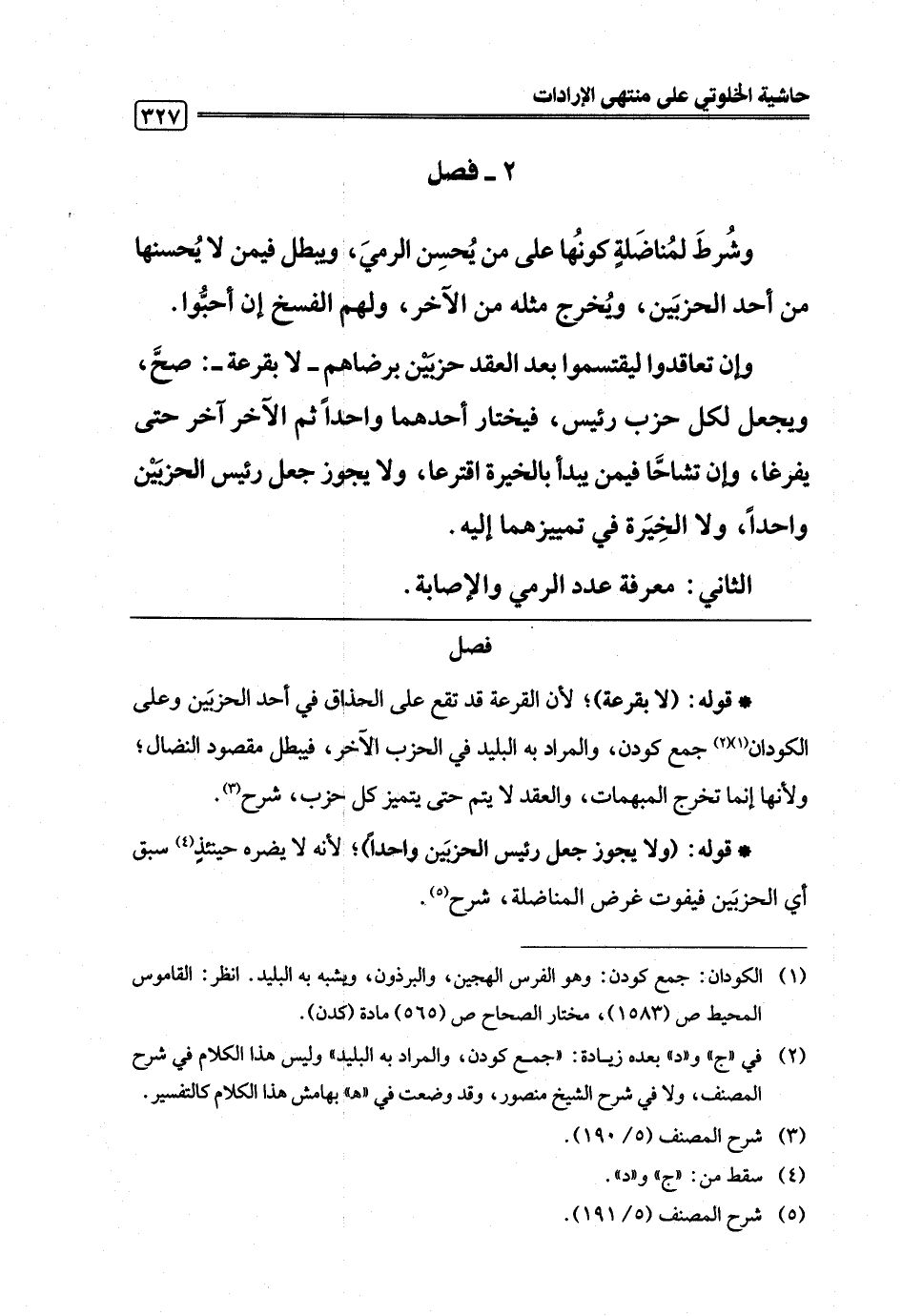 * قوله: (لا بقرعة)؛ لأن القرعة قد تقع على الحذاق في أحد الحزبَين وعلى الكودان (¬1) (¬2) جمع كودن، والمراد به البليد في الحزب الآخر، فيبطل مقصود النضال؛ ولأنها إنما تخرج المبهمات، والعقد لا يتم حتى يتميز كل حزب، شرح (¬3).