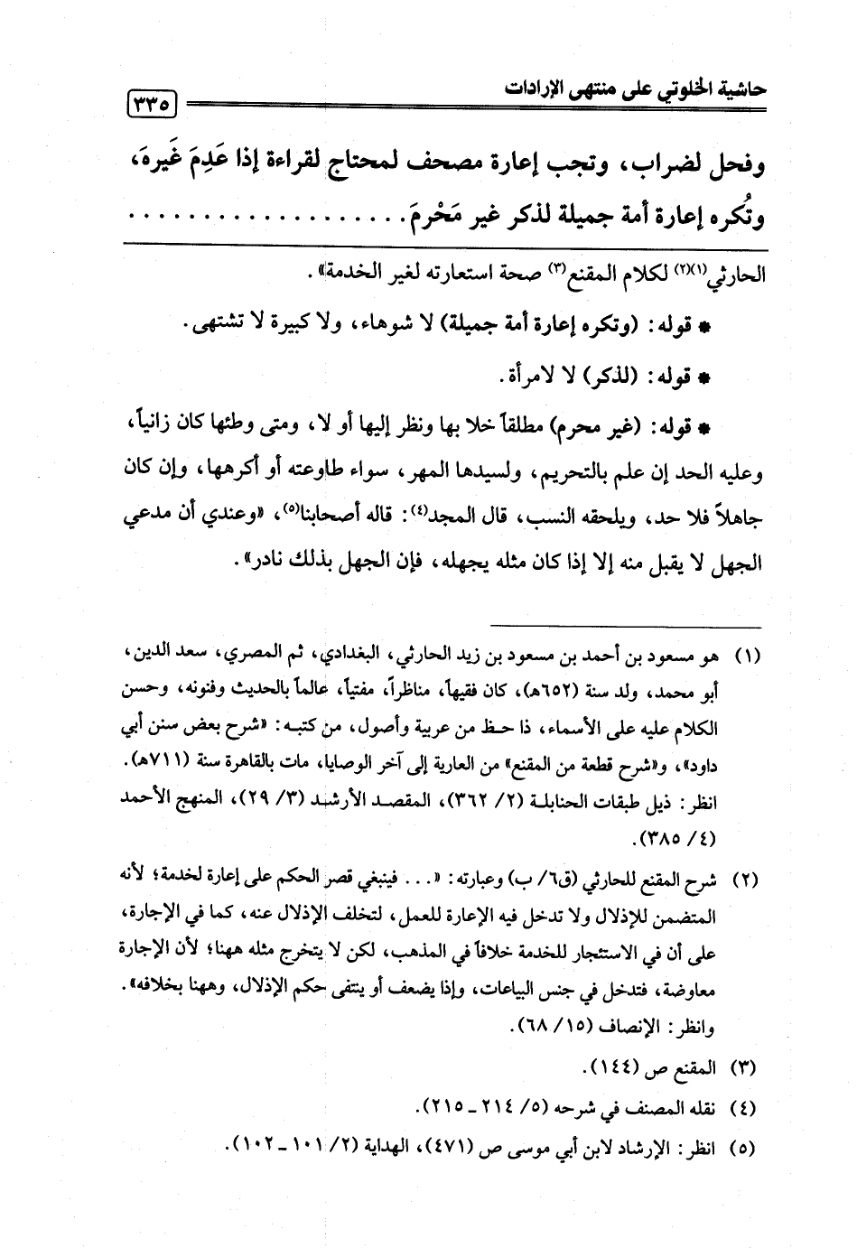 (¬2) شرح المقنع للحارثي (ق 6/ ب) وعبارته: ". . . فينبغي قصر الحكم على إعارة لخدمة؛ لأنه المتضمن للإذلال ولا تدخل فيه الإعارة للعمل، لتخلف الإذلال عنه، كما في الإجارة، على أن في الاستئجار للخدمة خلافًا في المذهب، لكن لا يتخرج مثله ههنا؛ لأن الأجارة معاوضة، فتدخل في جنس البياعات، وإذا يضعف أو ينتفى حكم الإذلال، وههنا بخلافه". وانظر: الإنصاف (15/ 68).